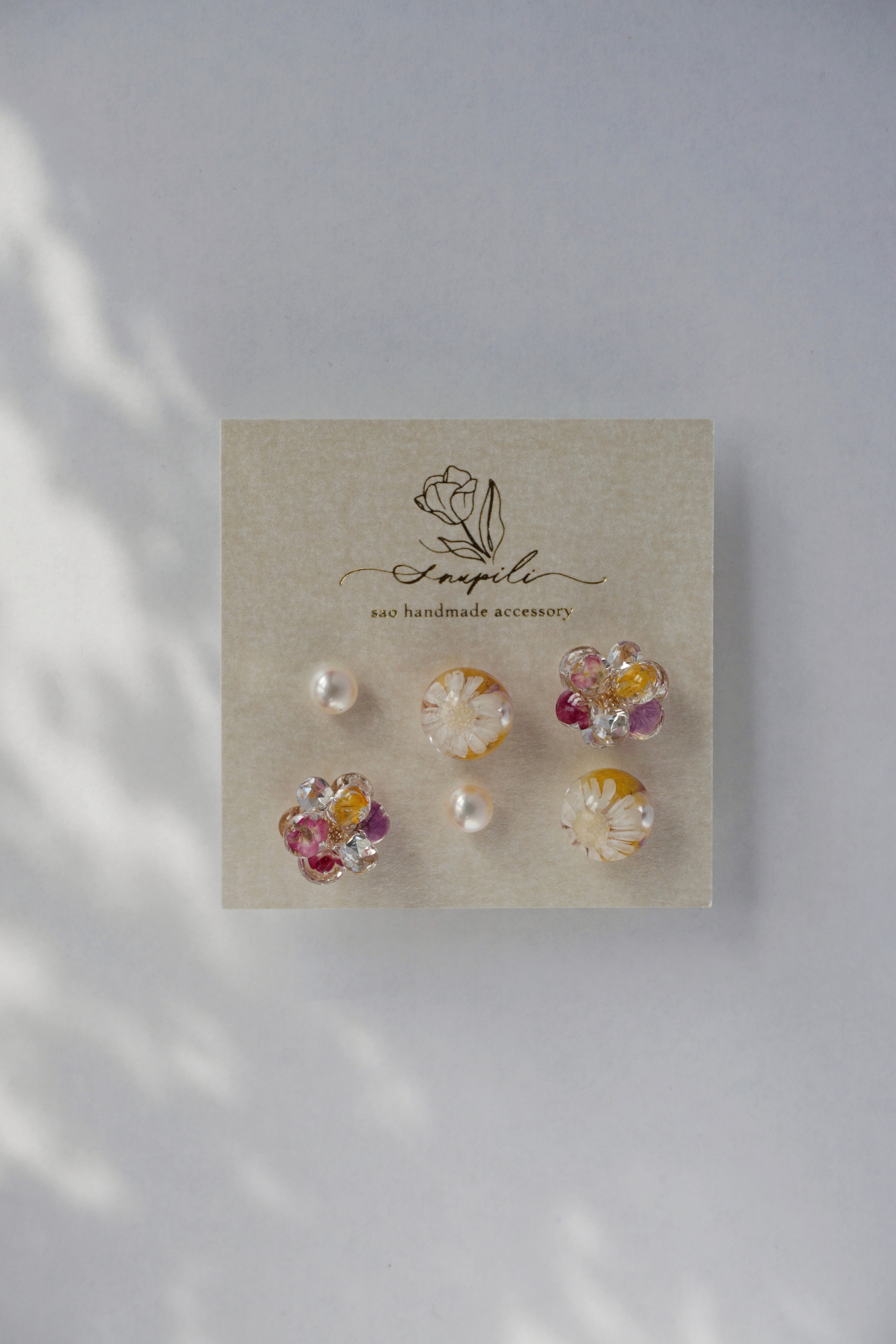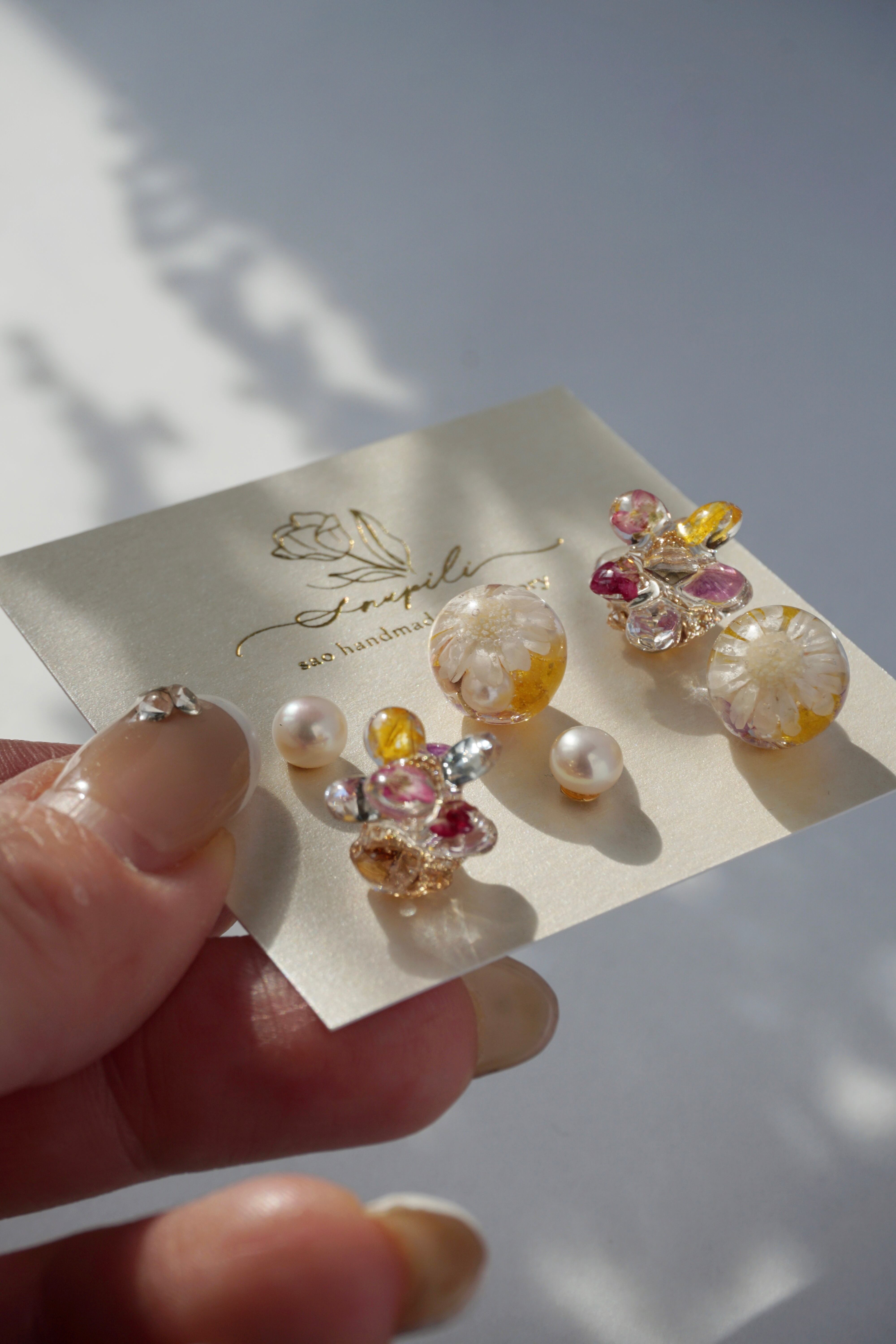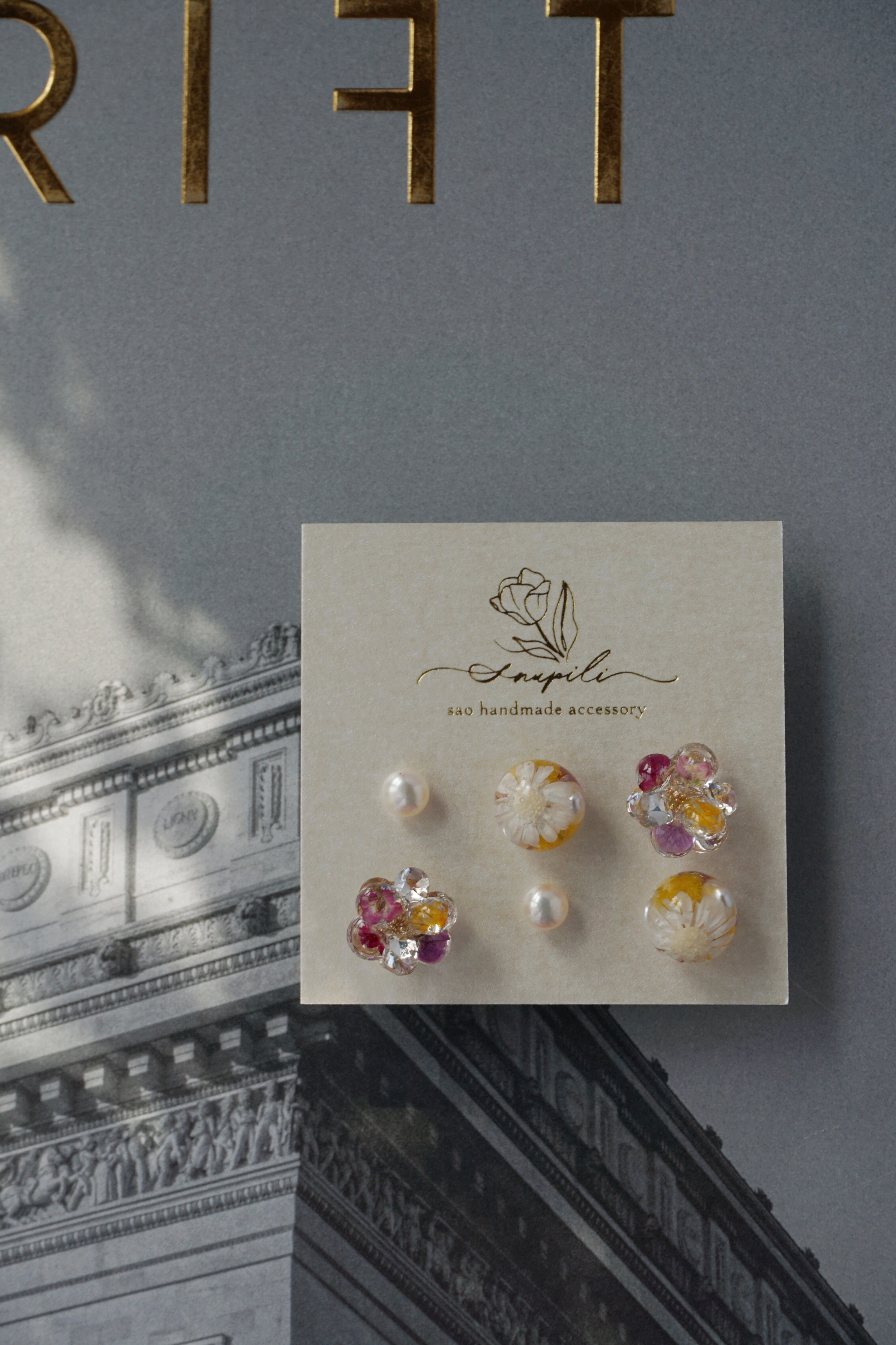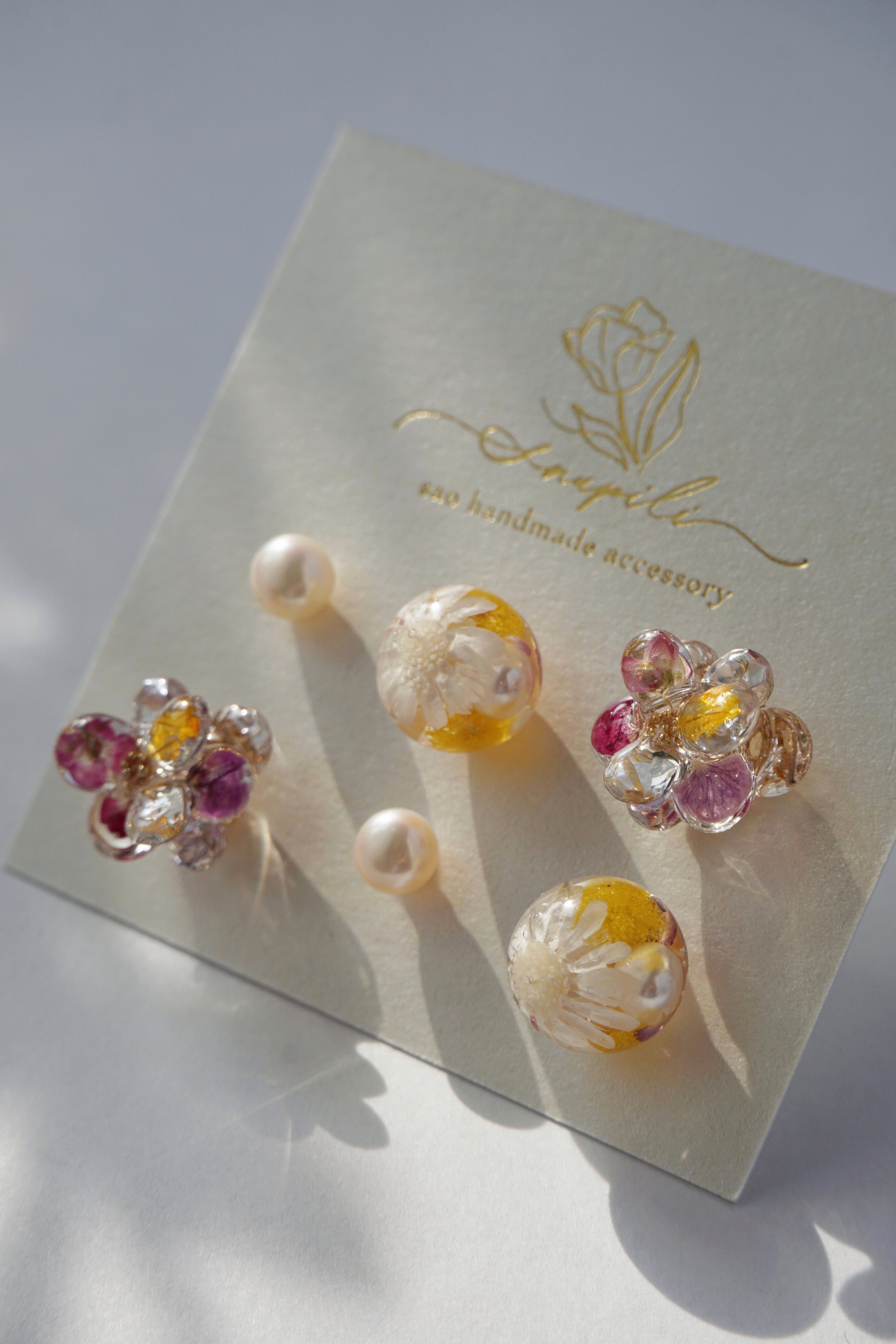 レジンとドライフラワー(アリッサム)で1枚1枚作った5mmの花びらと、ガラスラインストーンの花びらを9枚組み合わせて、ひとつのお花が出来ております。春らしく可愛らしいデザインでありながら、一年を通してどんなお洋服にも合わせやすいよう制作いたしました。