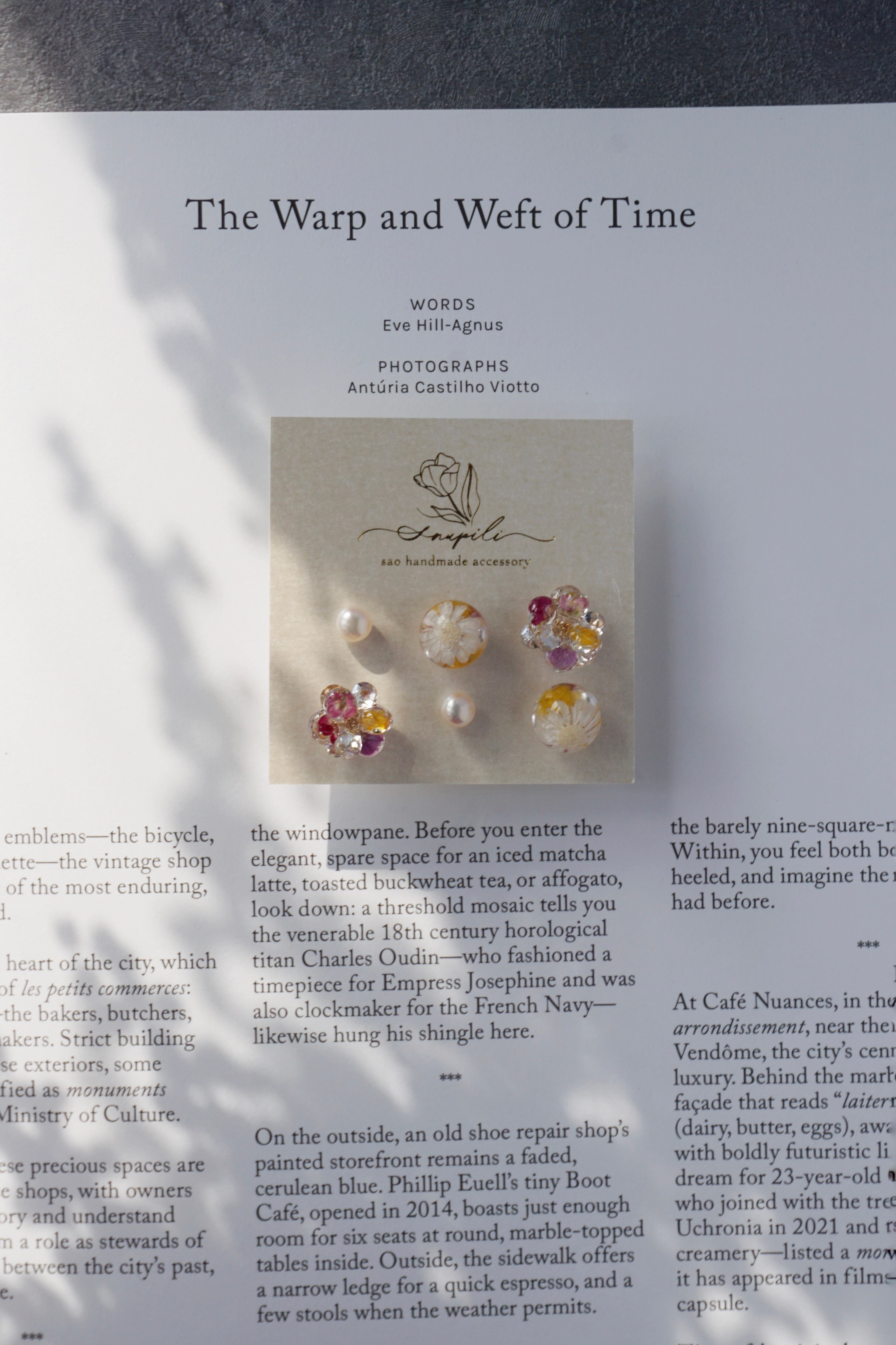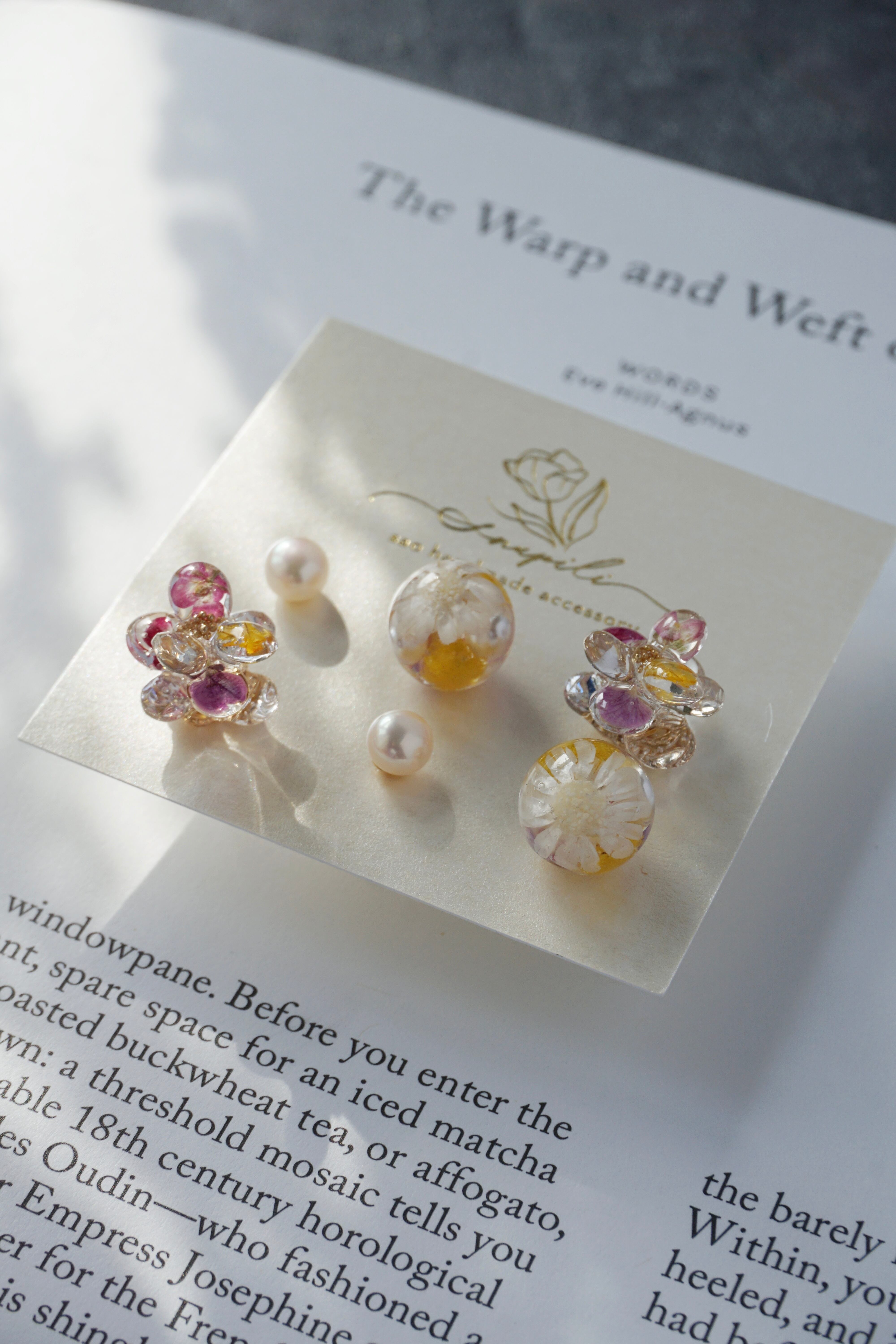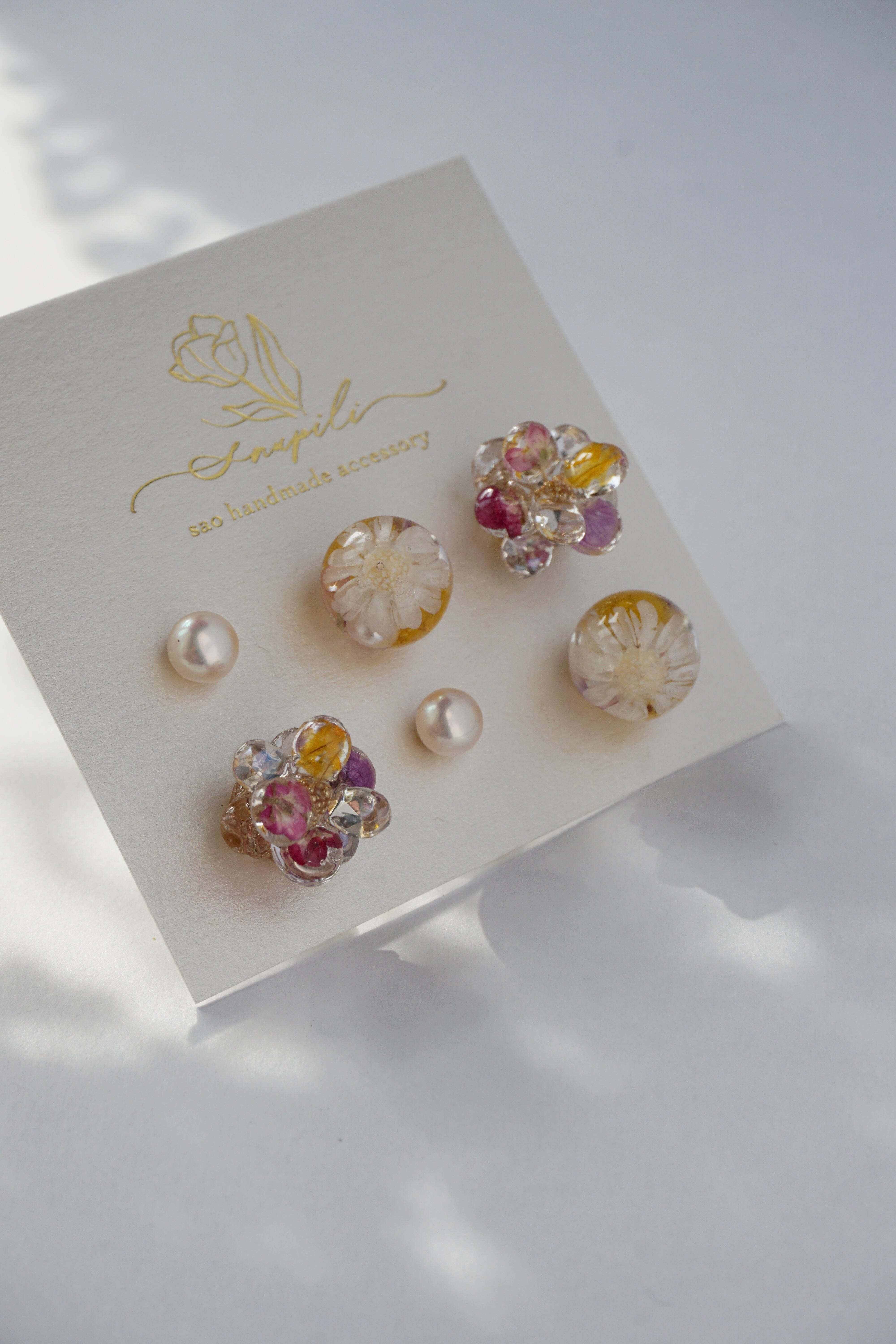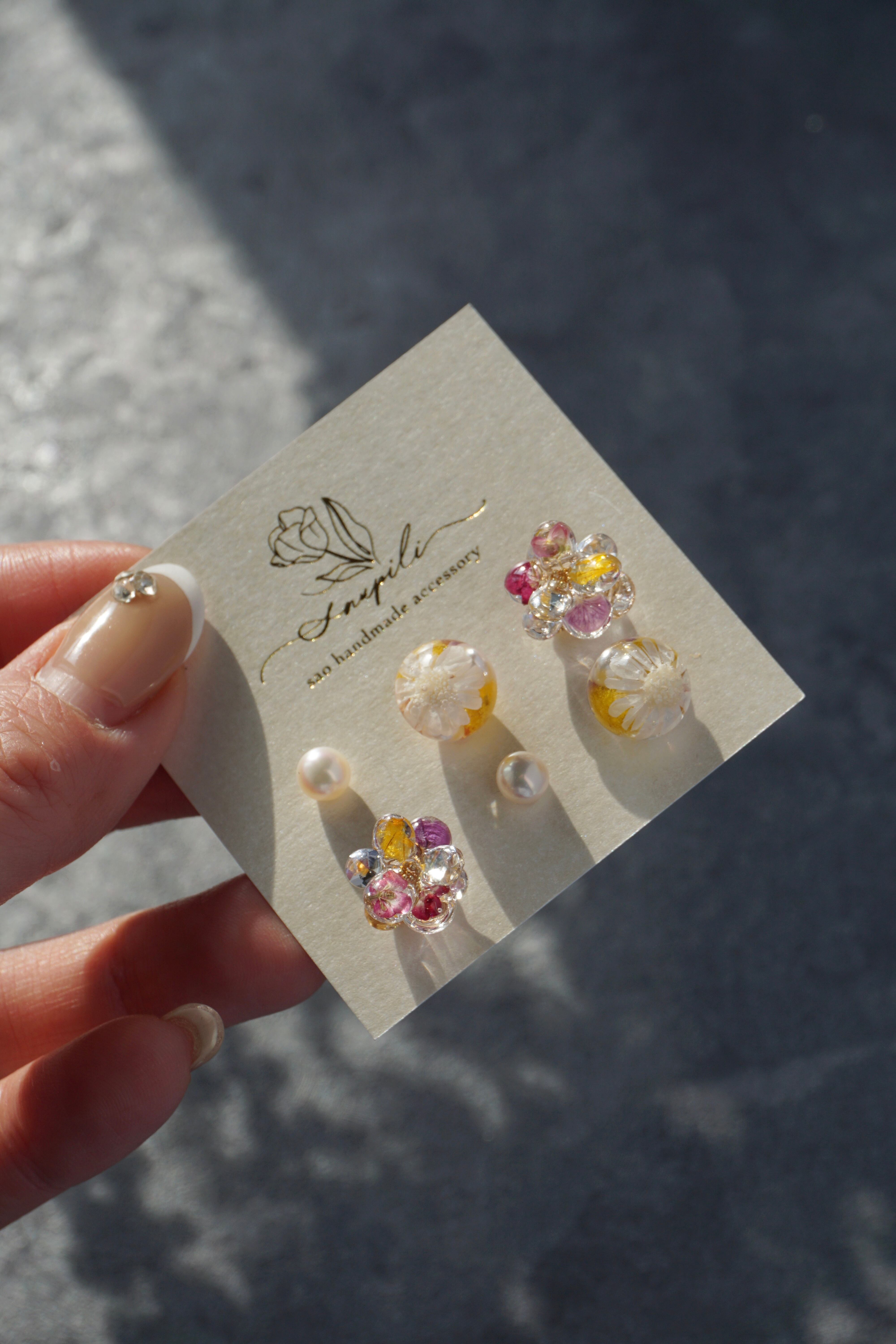 レジンとドライフラワー(アリッサム)で1枚1枚作った5mmの花びらと、ガラスラインストーンの花びらを9枚組み合わせて、ひとつのお花が出来ております。春らしく可愛らしいデザインでありながら、一年を通してどんなお洋服にも合わせやすいよう制作いたしました。