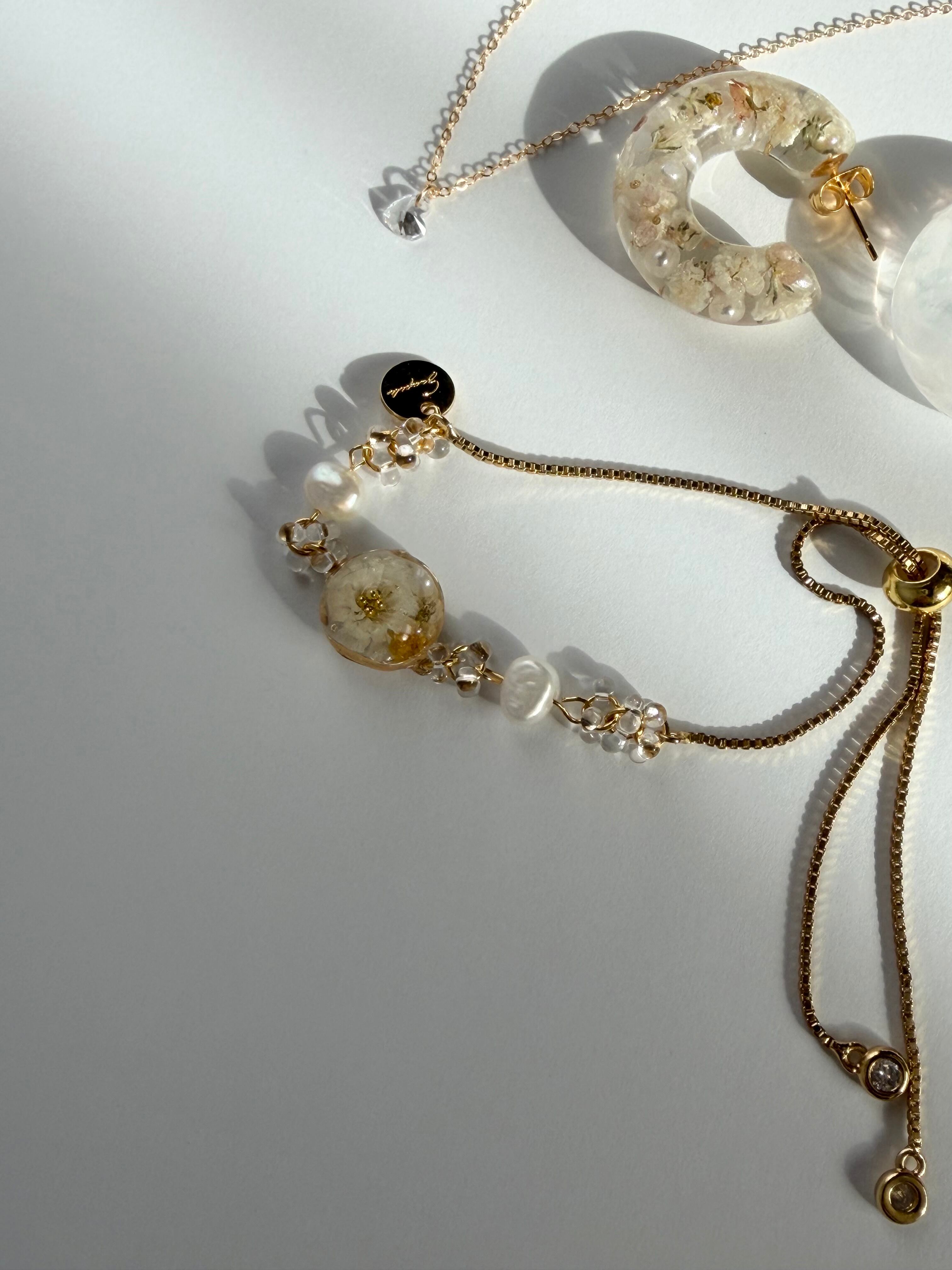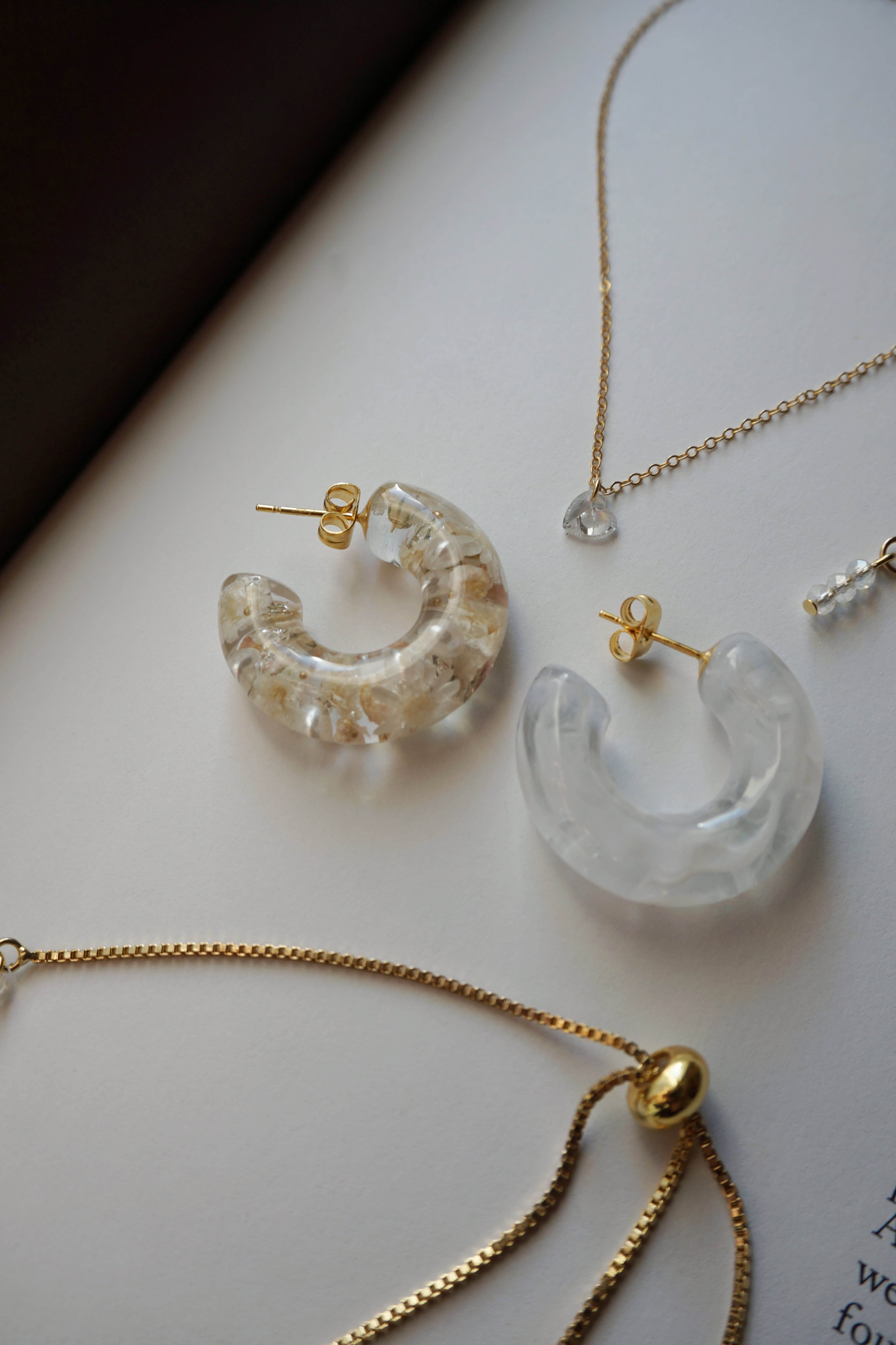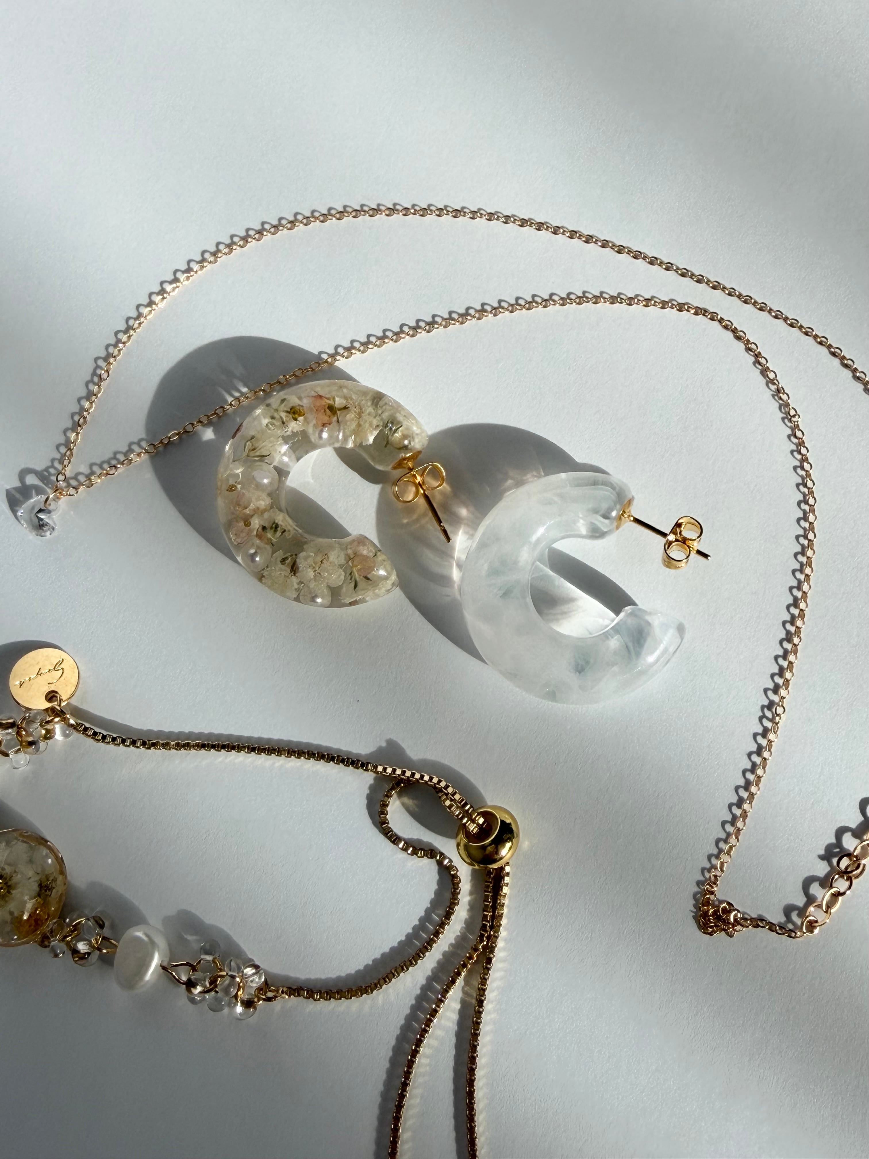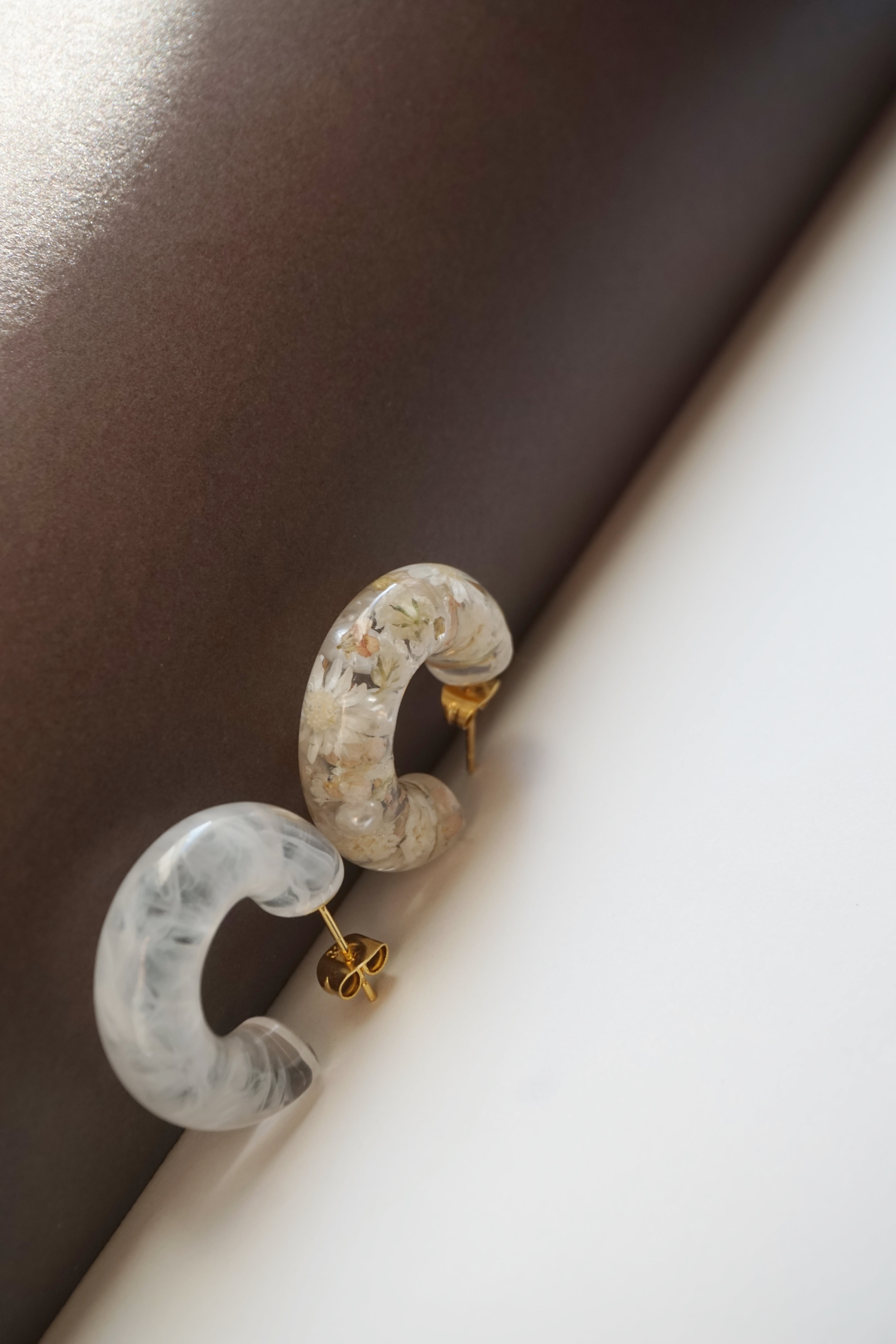 カラーとドライフラワーのアシンメトリーなデザインで、ゆるいCカーブと絶妙な厚みが、お洒落な耳元を演出してくれます。