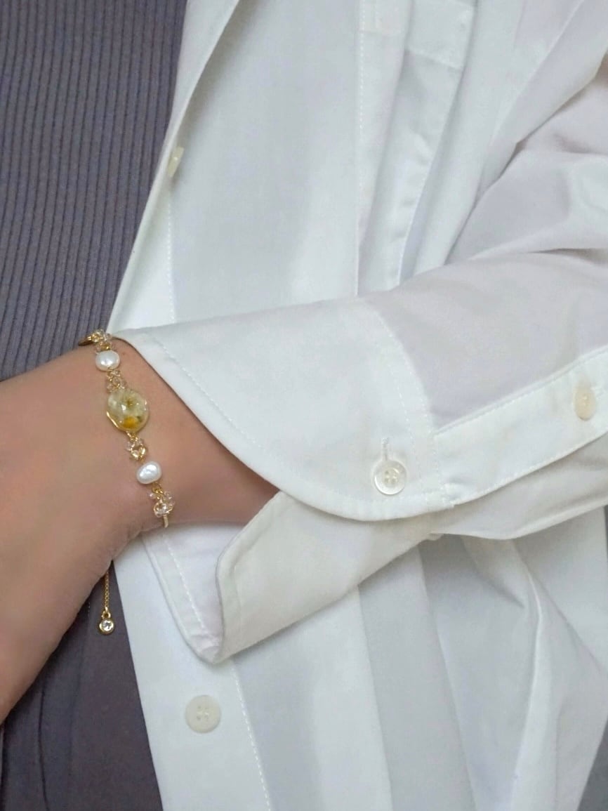 高品質な淡水パールが2つと、ガラスビーズを繋げ、手元が華奢に細く見えるようにデザインしています。