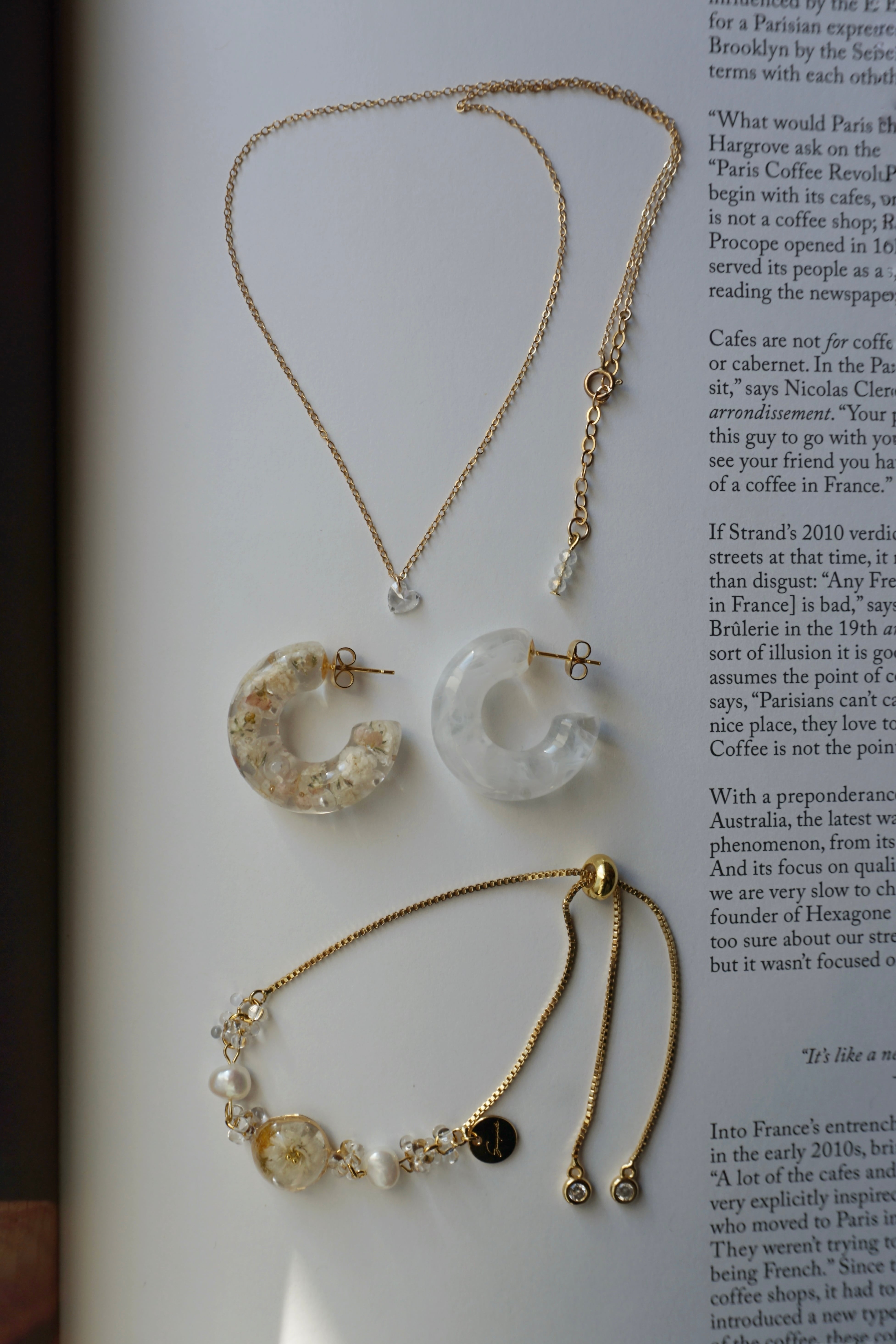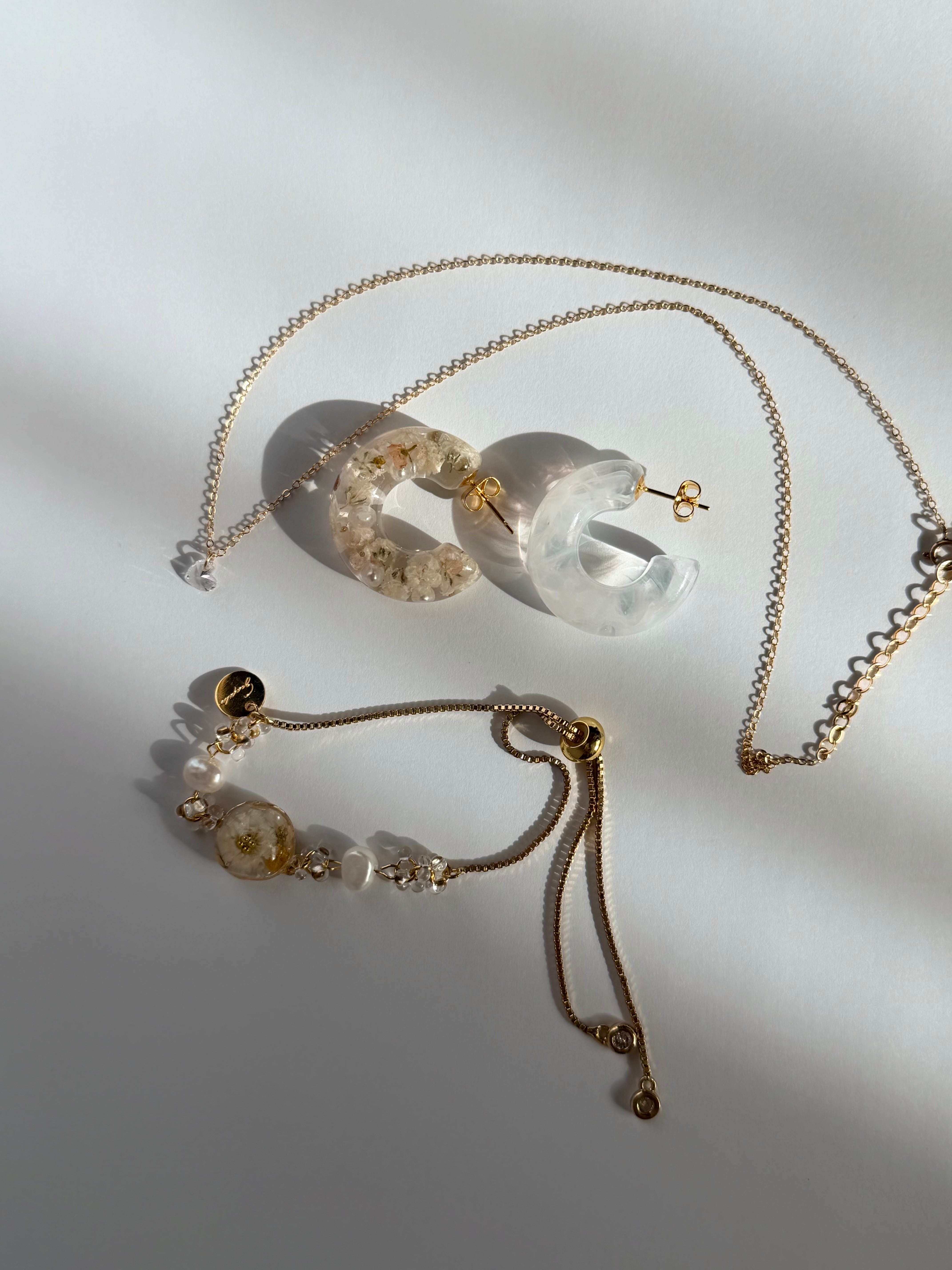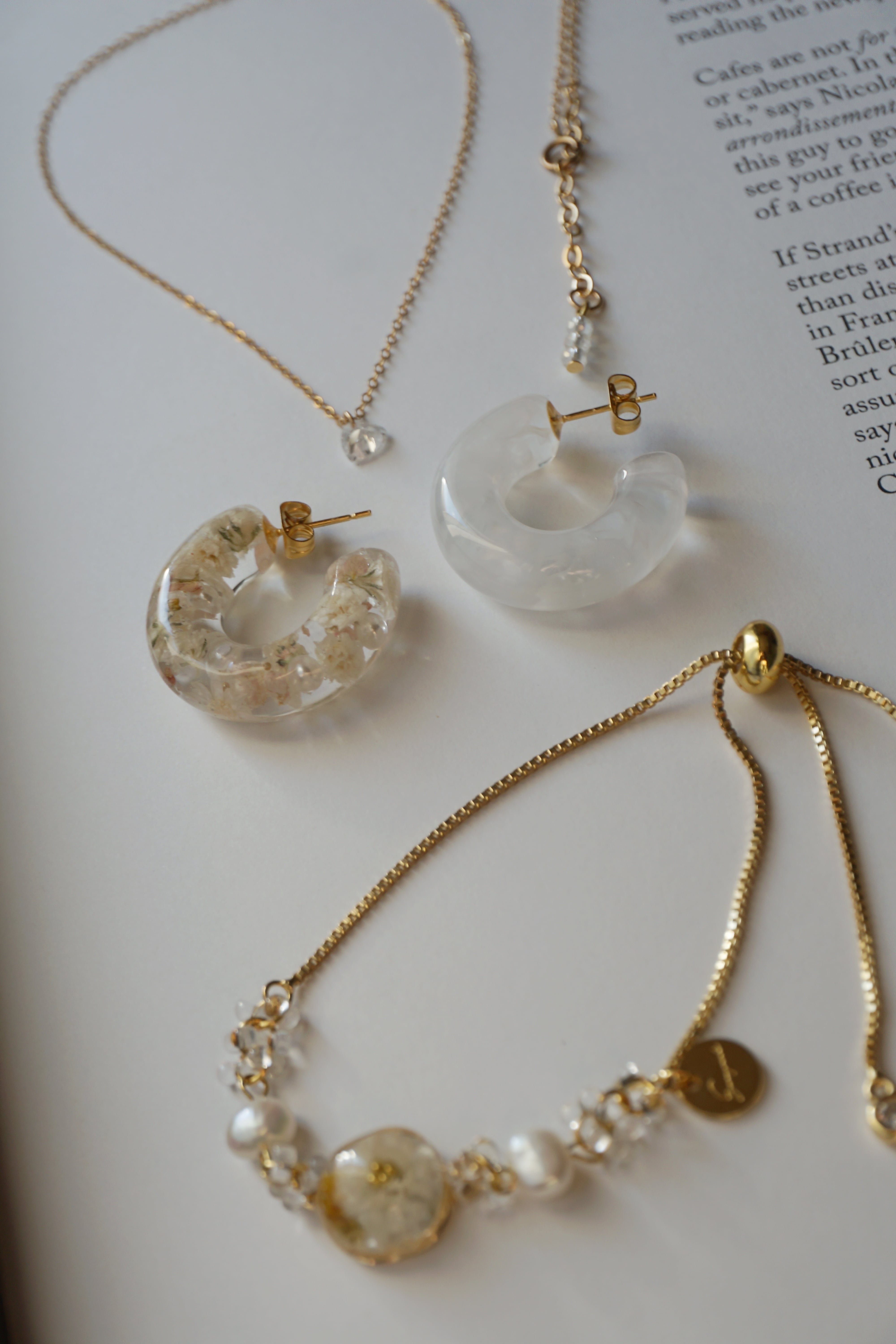 ピアス、ブレスレット、ネックレスの3点セットです。