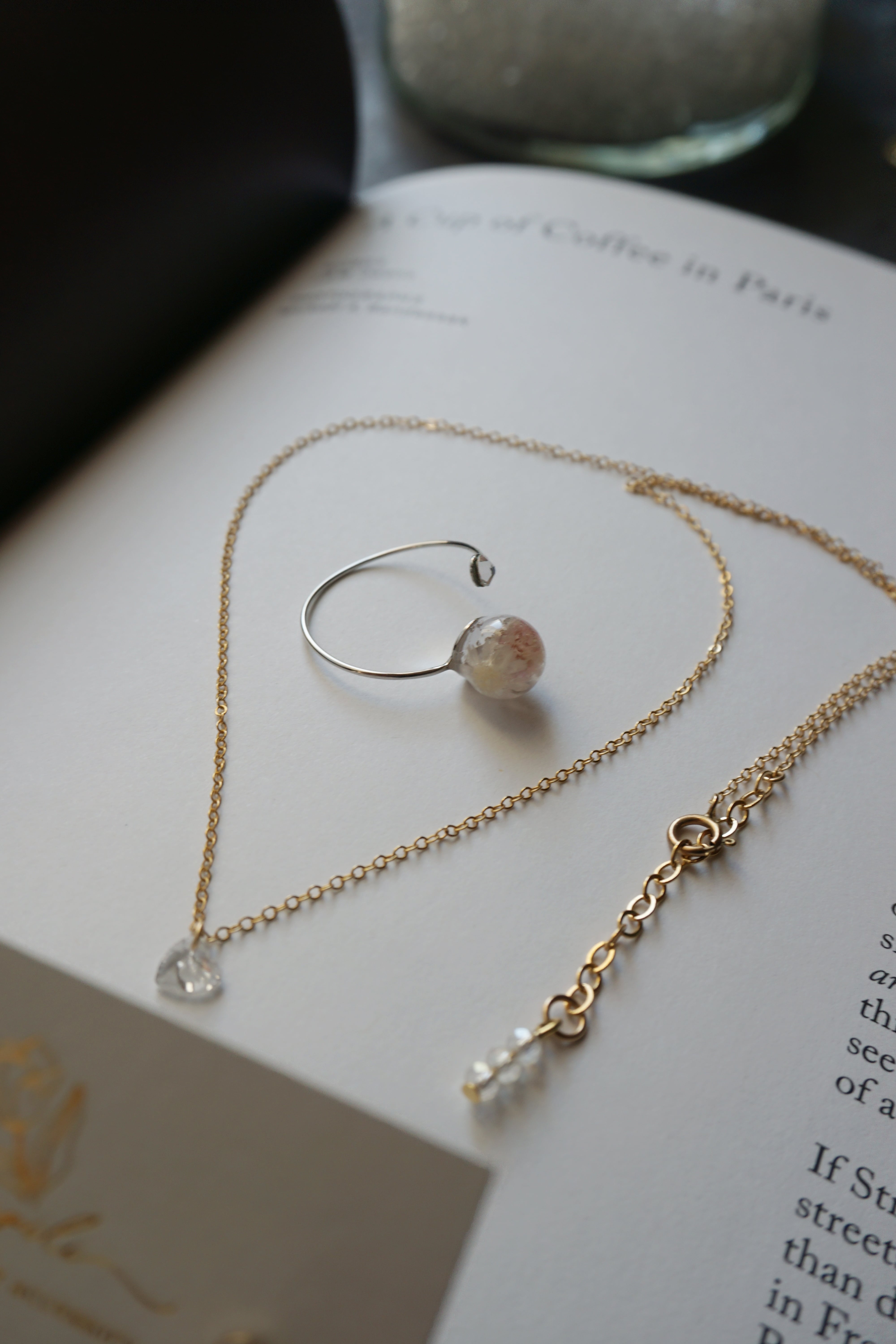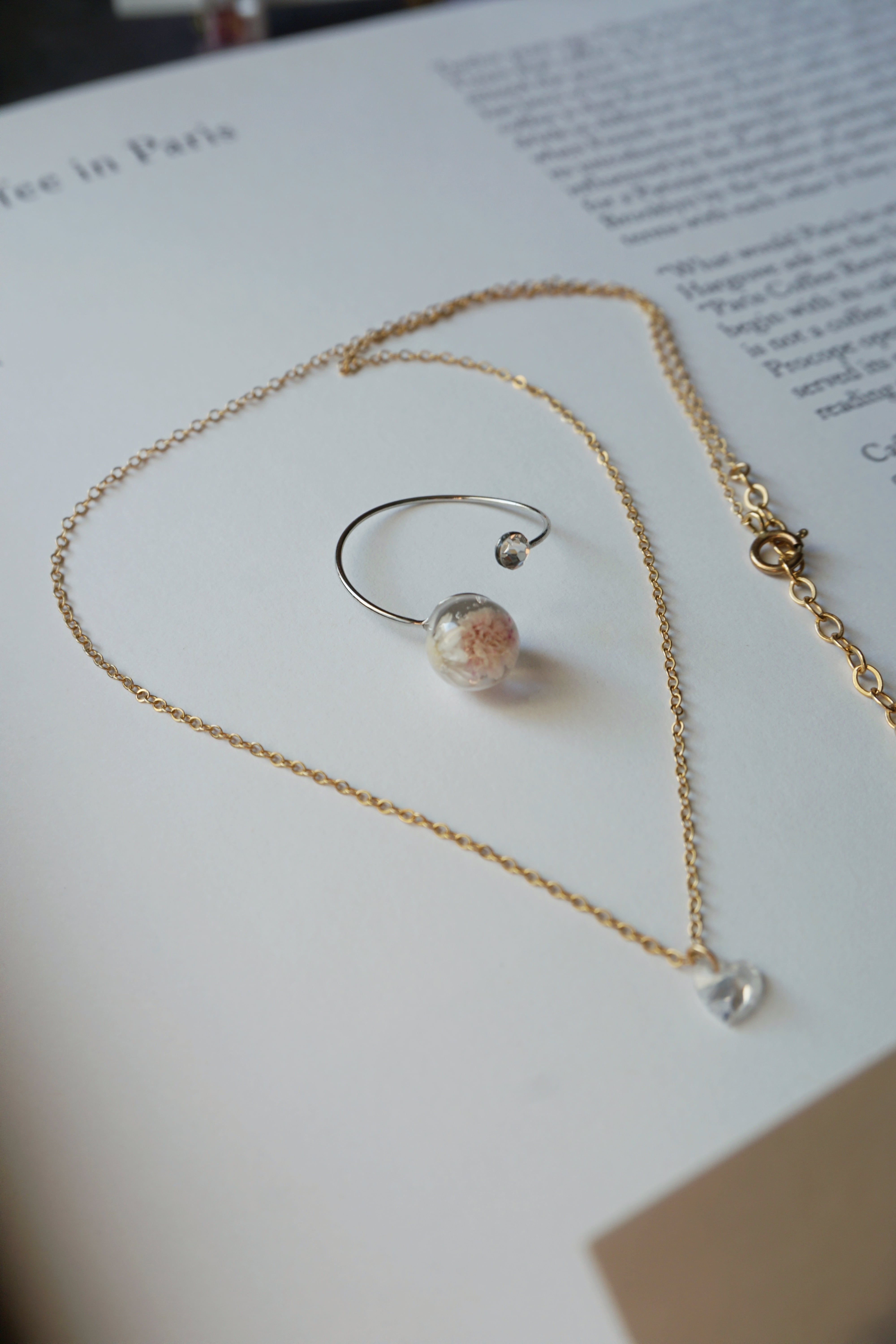透明感溢れるお花の球体は手元を見るたびに癒されること間違いなし。