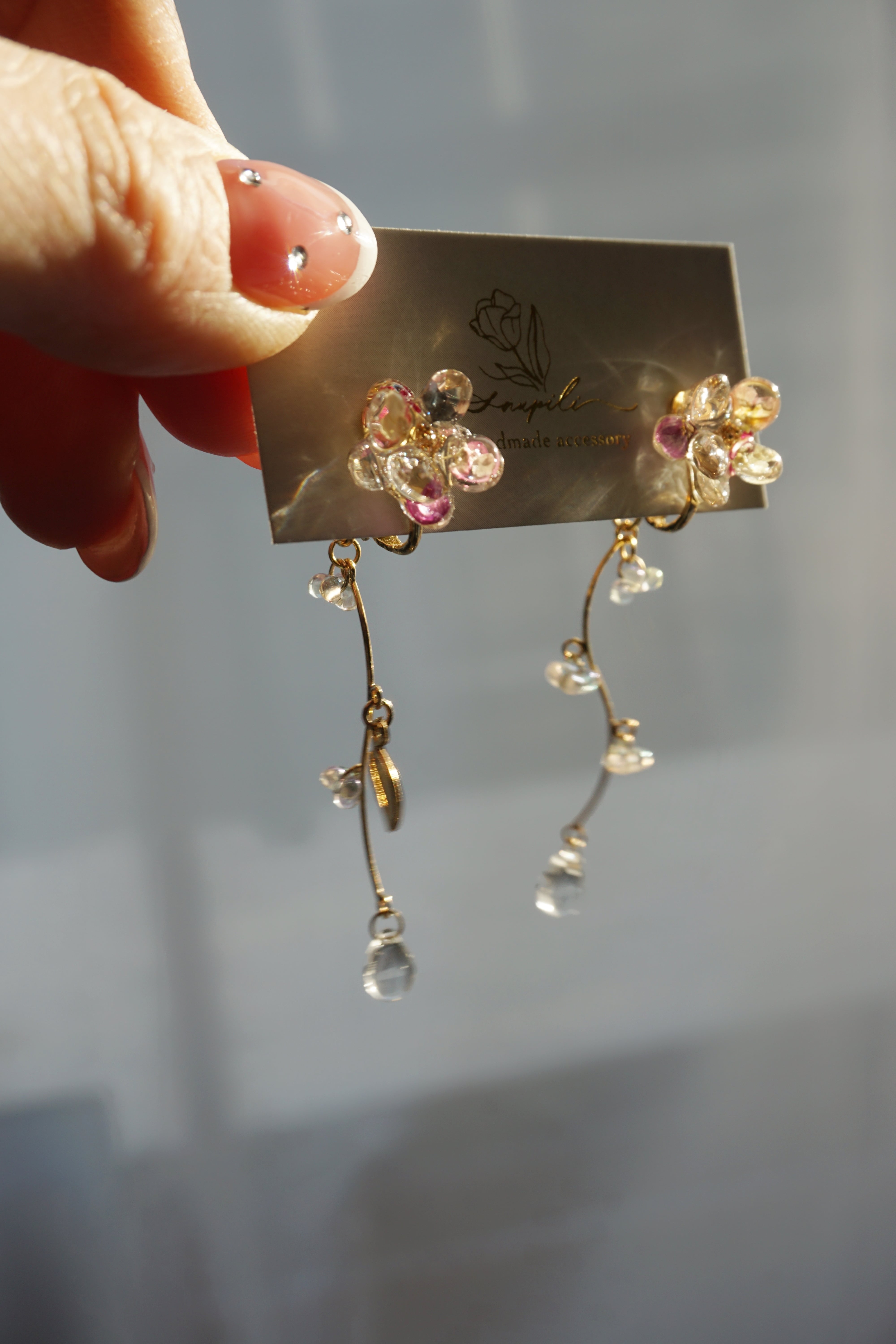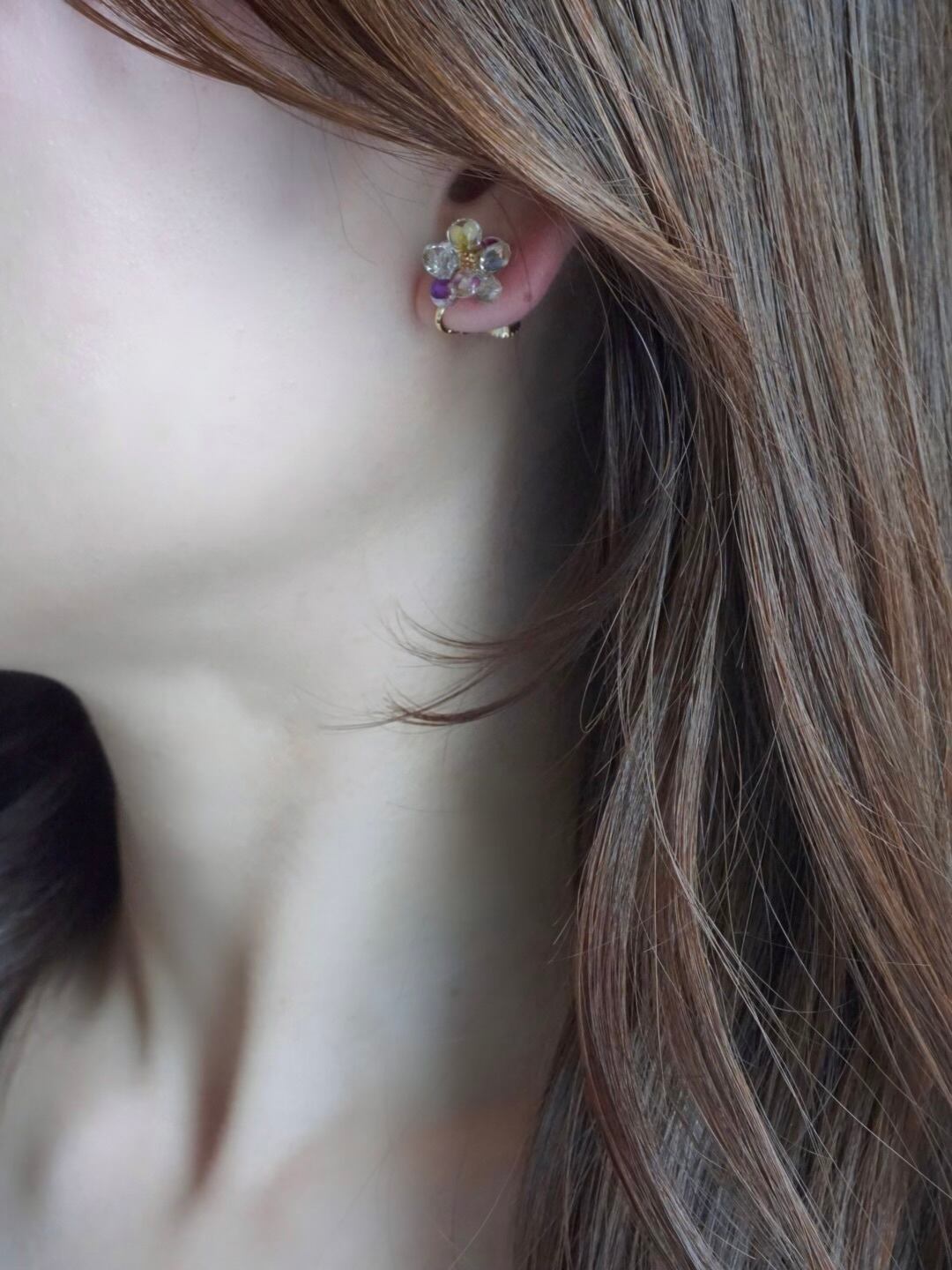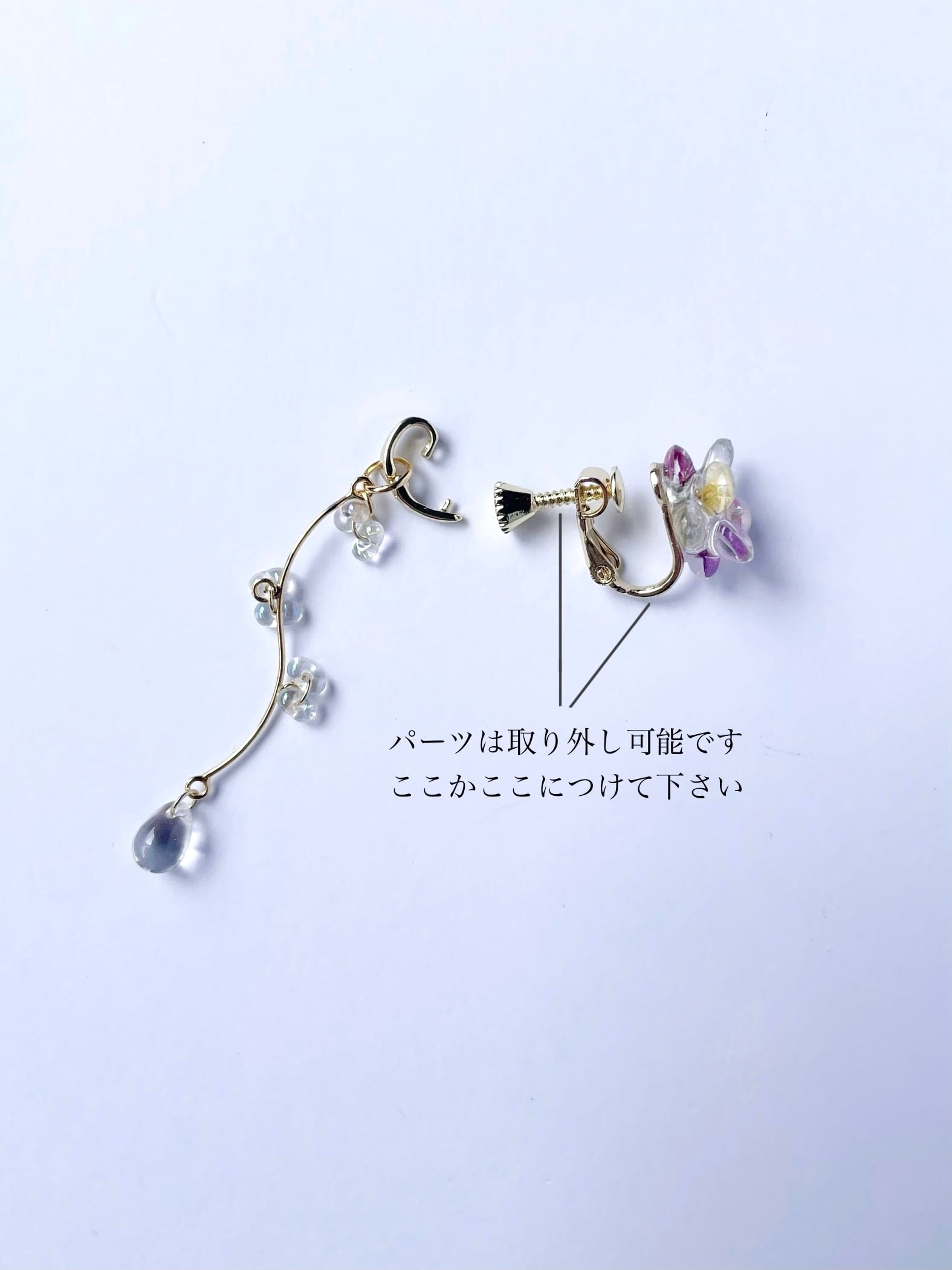 お花は1cmほどの大きさなので、シンプルにお花だけでつけたり、気分に合わせて揺れるパーツをつけたりしてお楽しみ下さい。