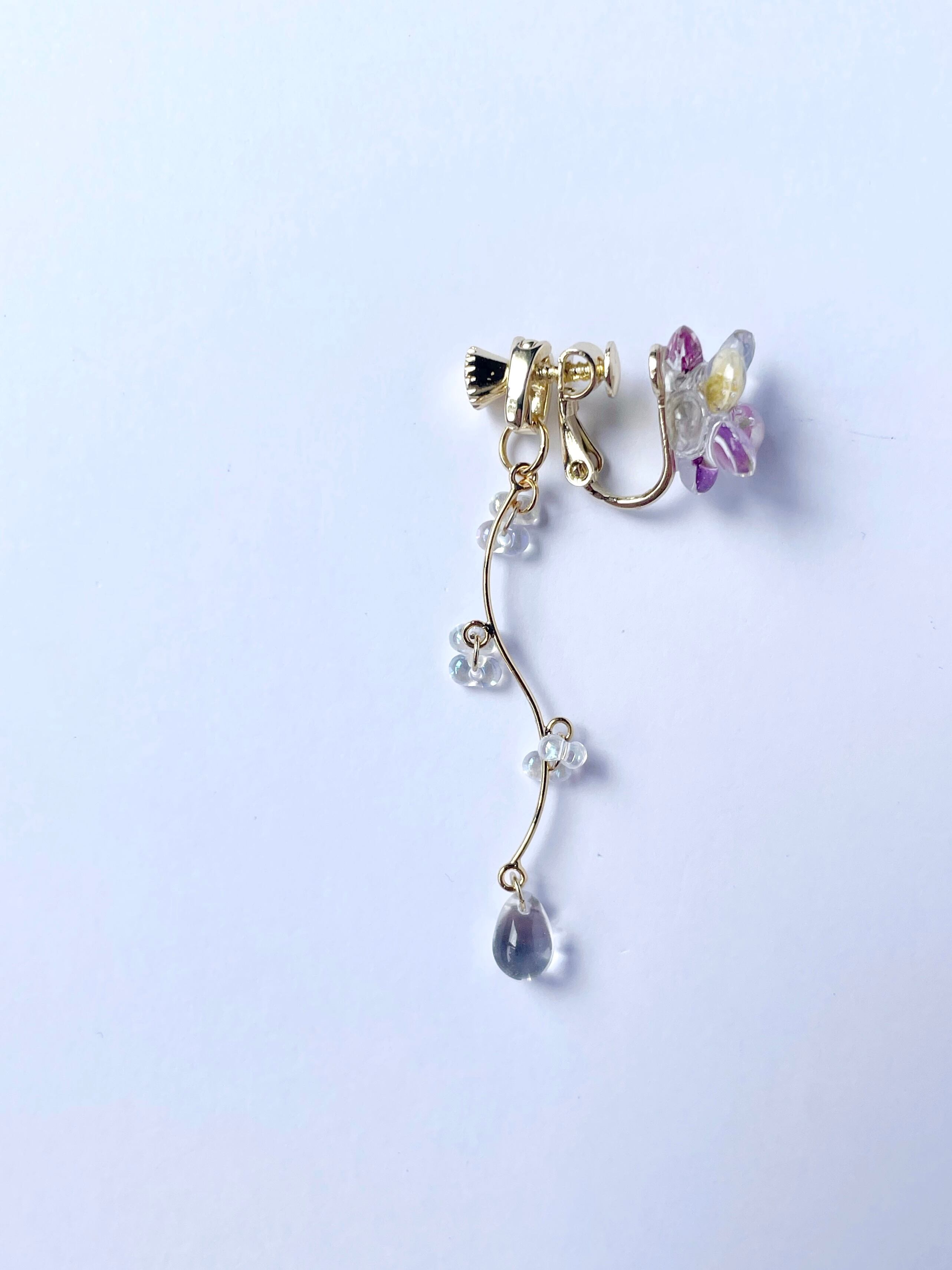 オーロラ色の粒々ビーズとクリアの雫ビーズを合わせ、ゆらゆら茎が風に揺れるようなイメージで仕上げています。