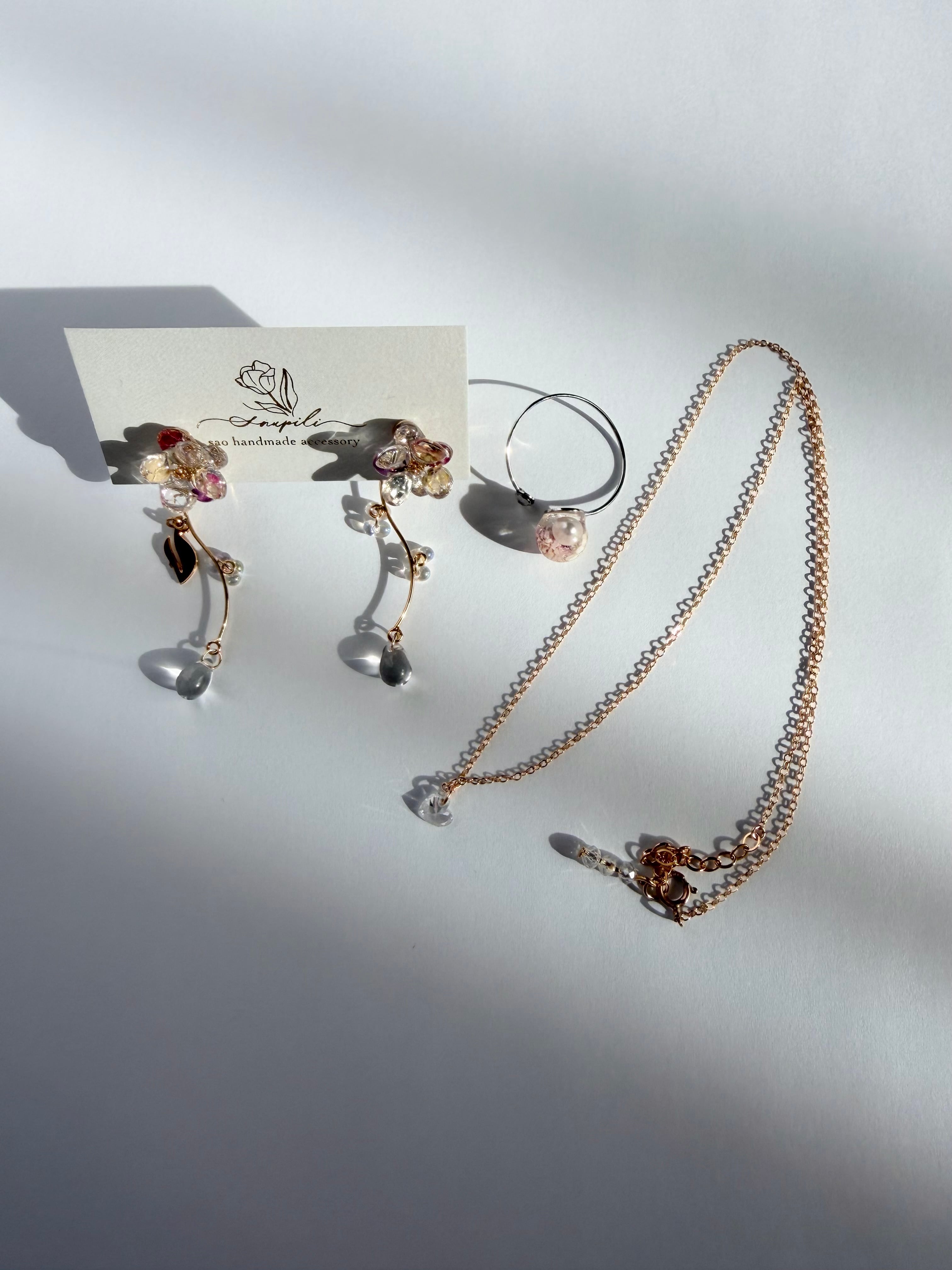 ※ネックレス、イヤリングはゴールド、リングはシルバーです