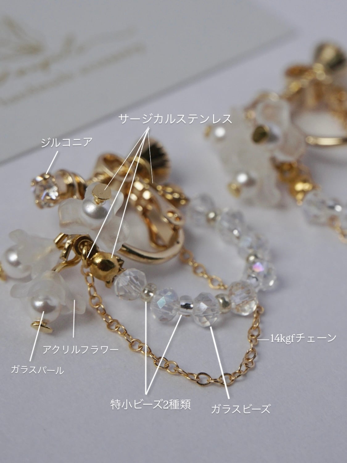 ガラスビーズ、アクリルフラワー、クリスタルパール、14kgf、サージカルステンレス、テグス