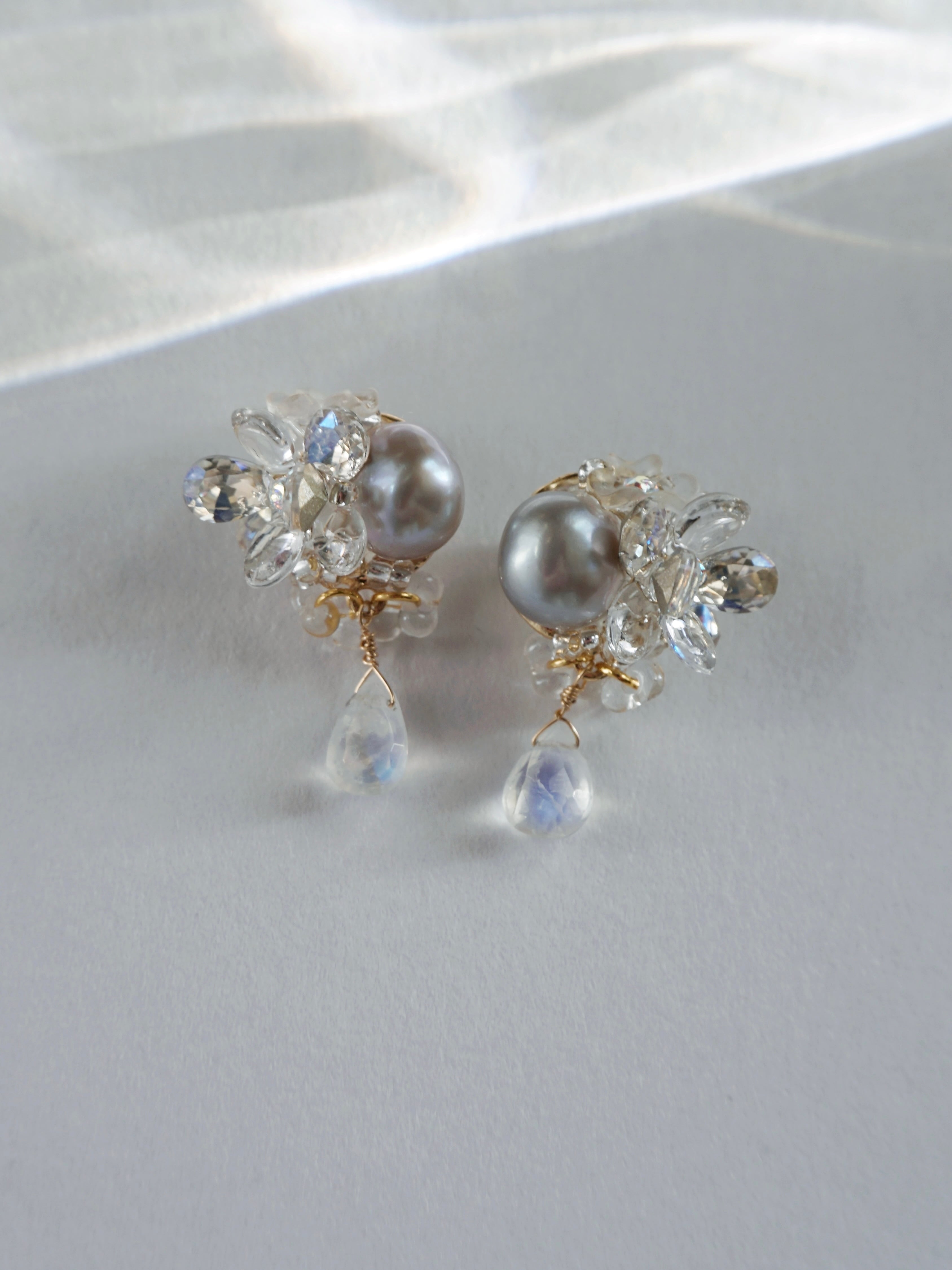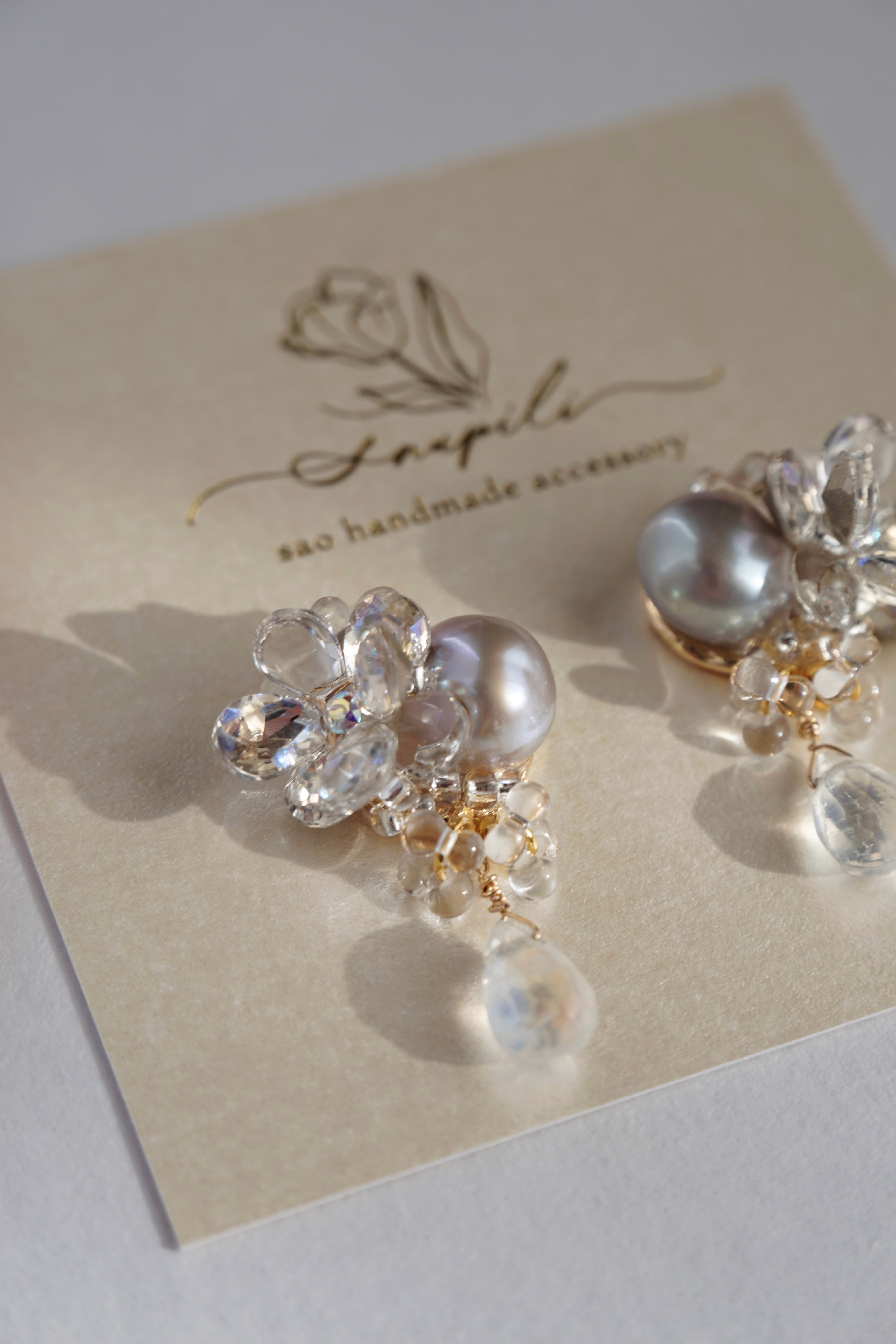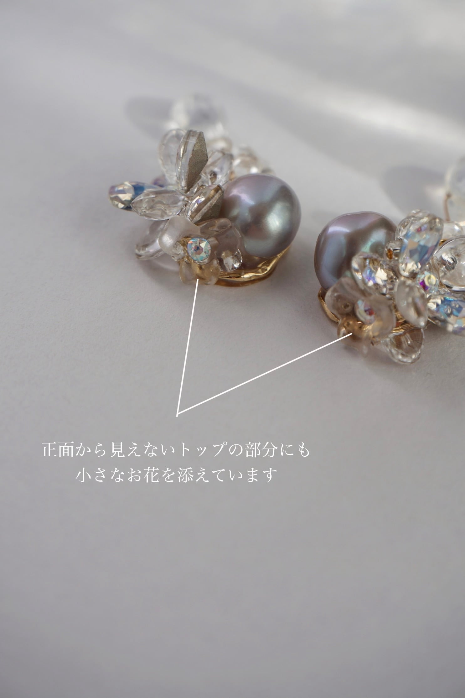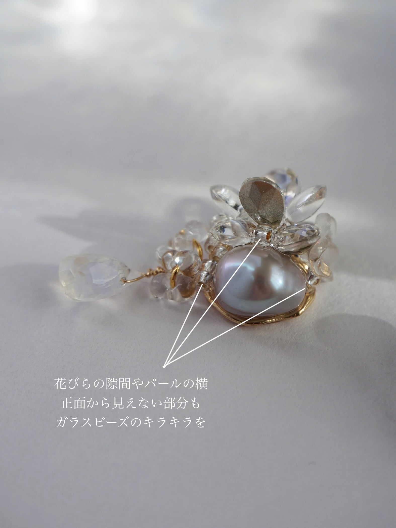 キラキラ輝くお花、天然石ラブラドライト、ふんわり優しいグレーの淡水パールが合わさった豪華な耳飾り。