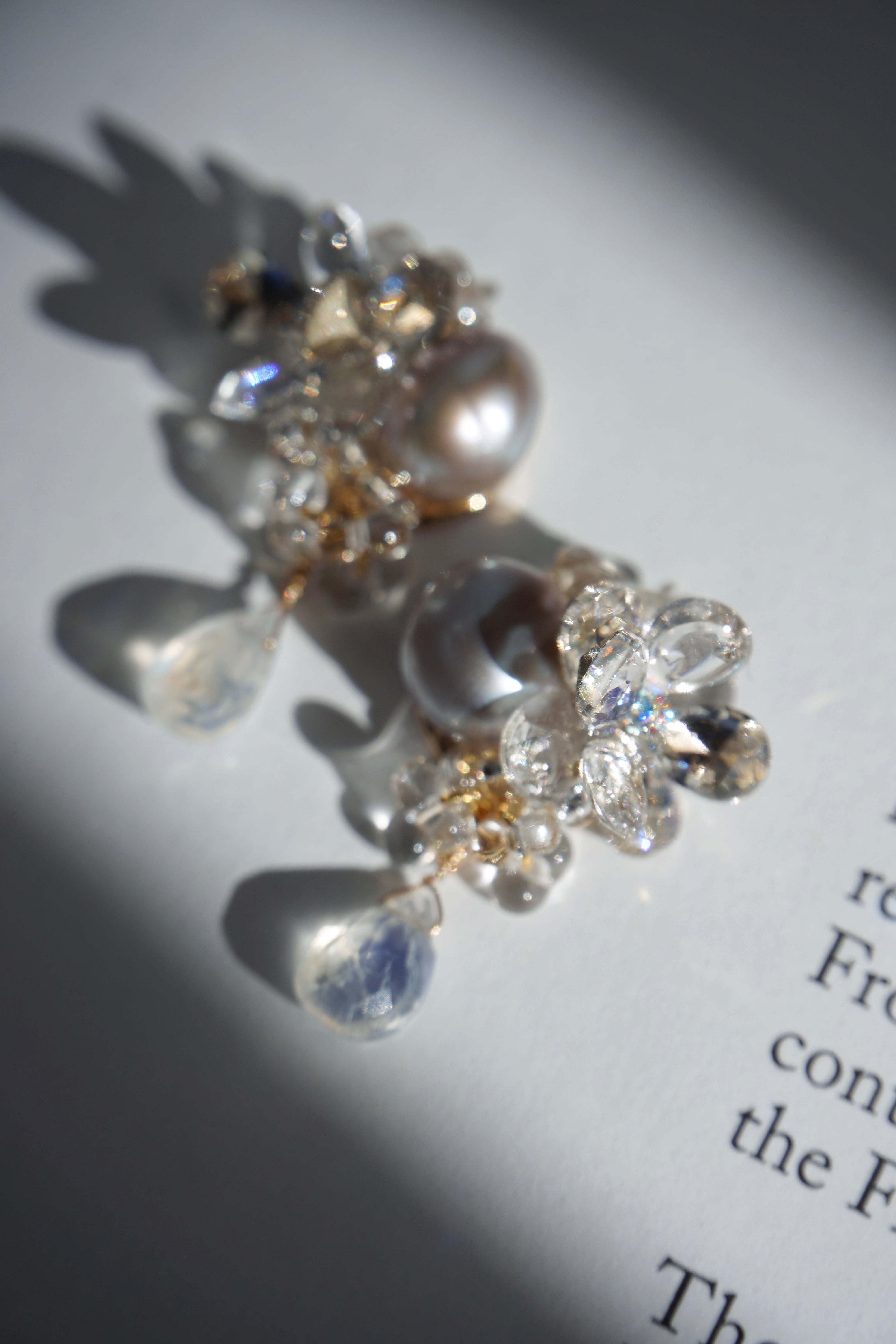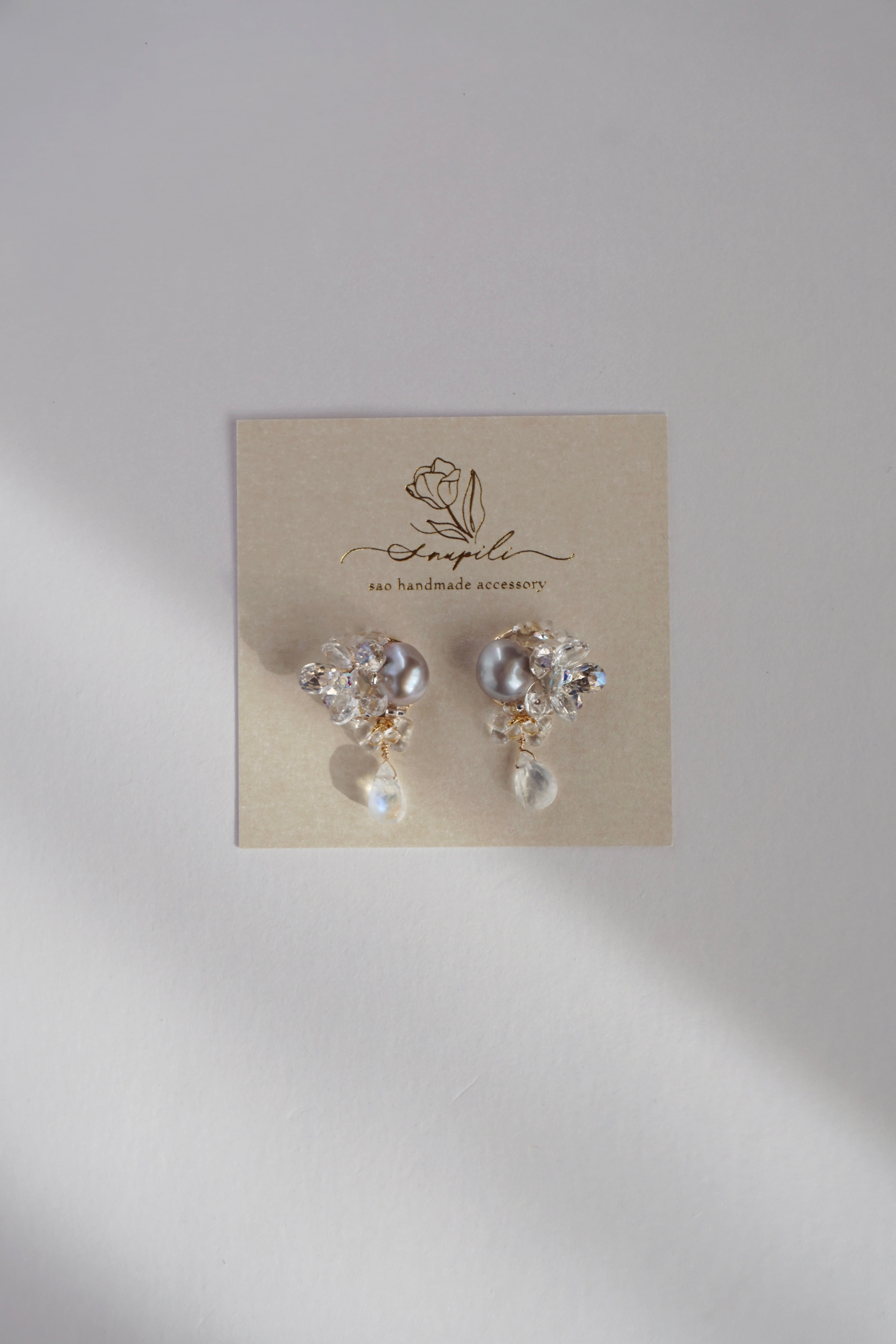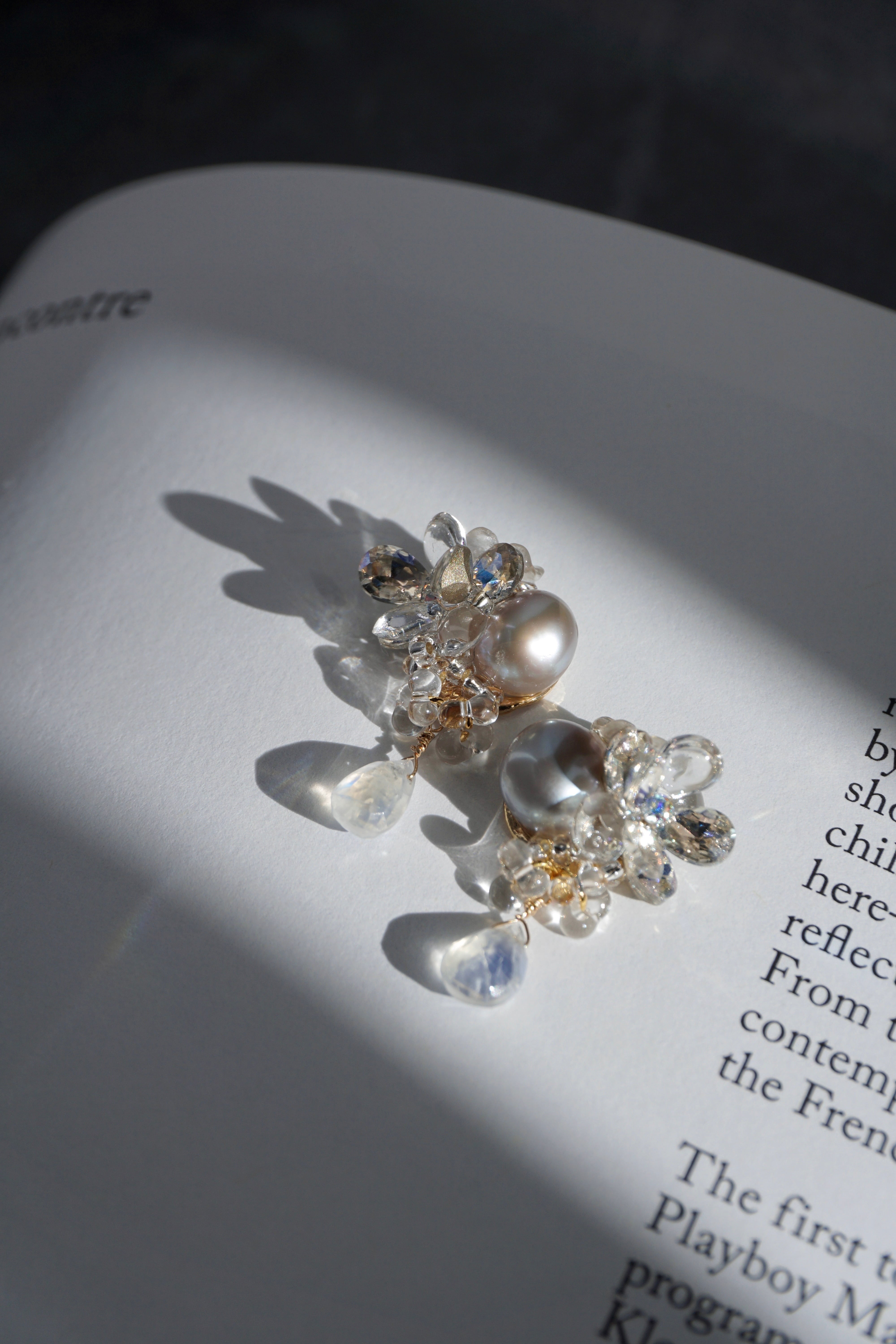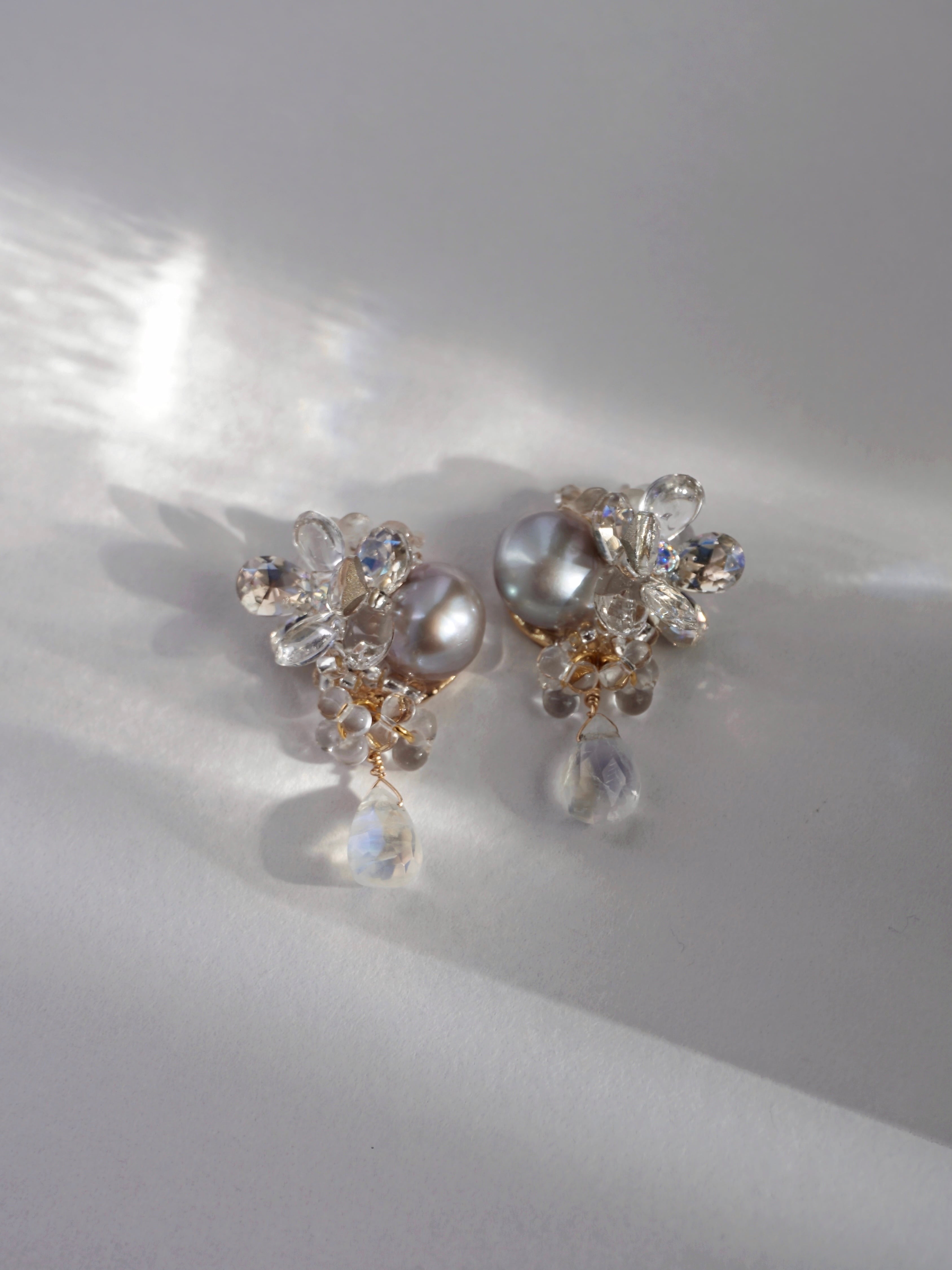 キラキラ輝くお花、天然石ラブラドライト、ふんわり優しいグレーの淡水パールが合わさった豪華な耳飾り。