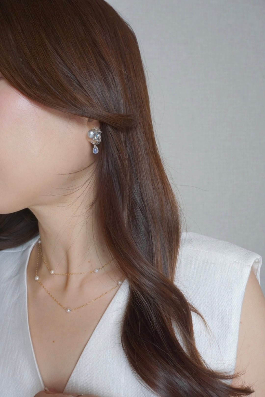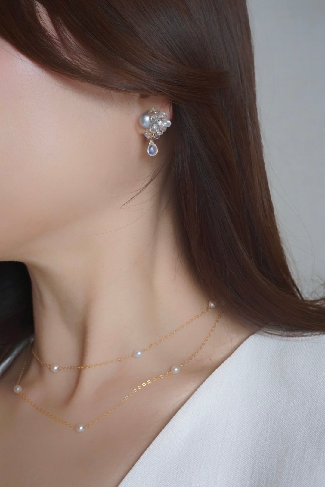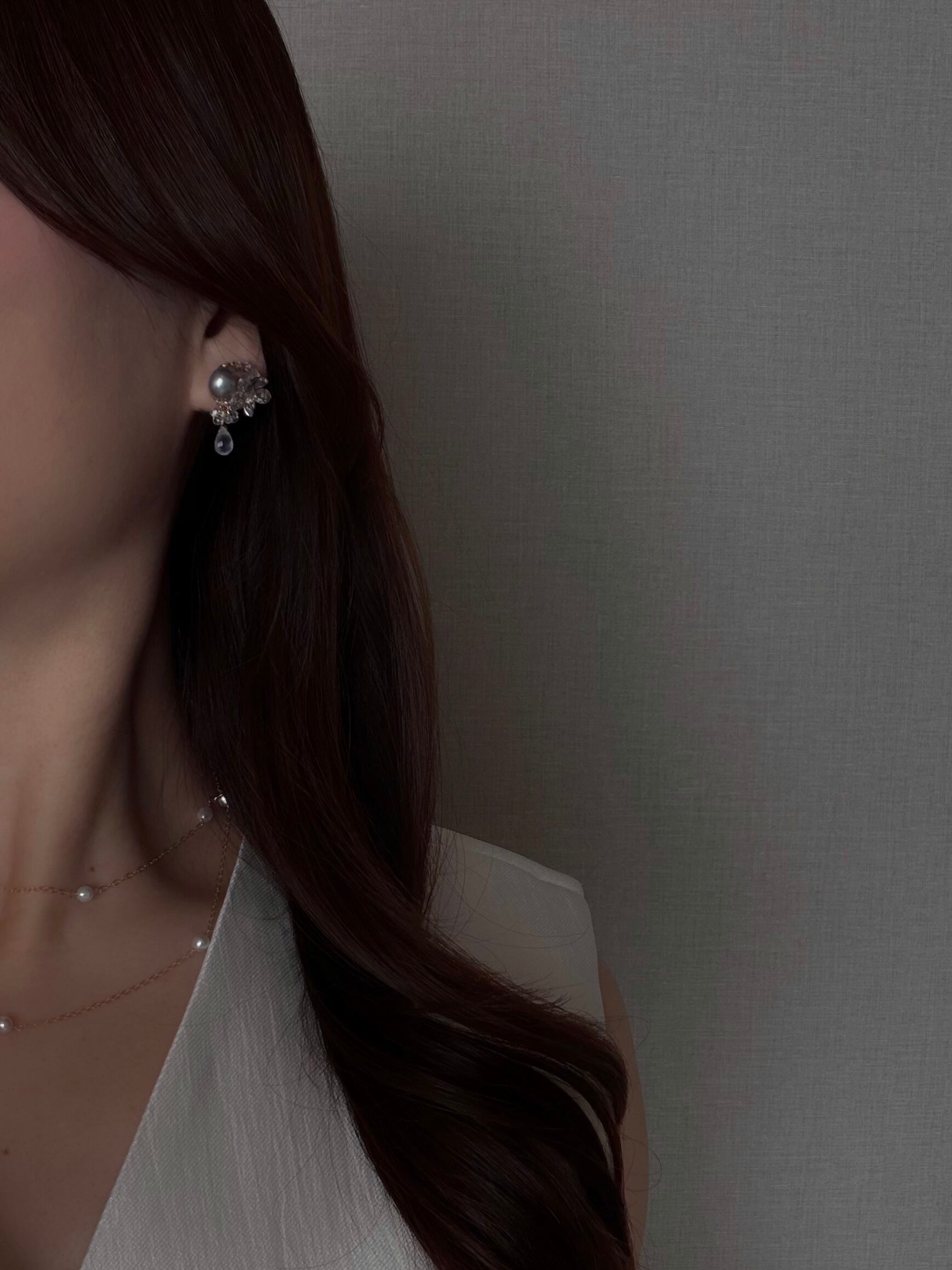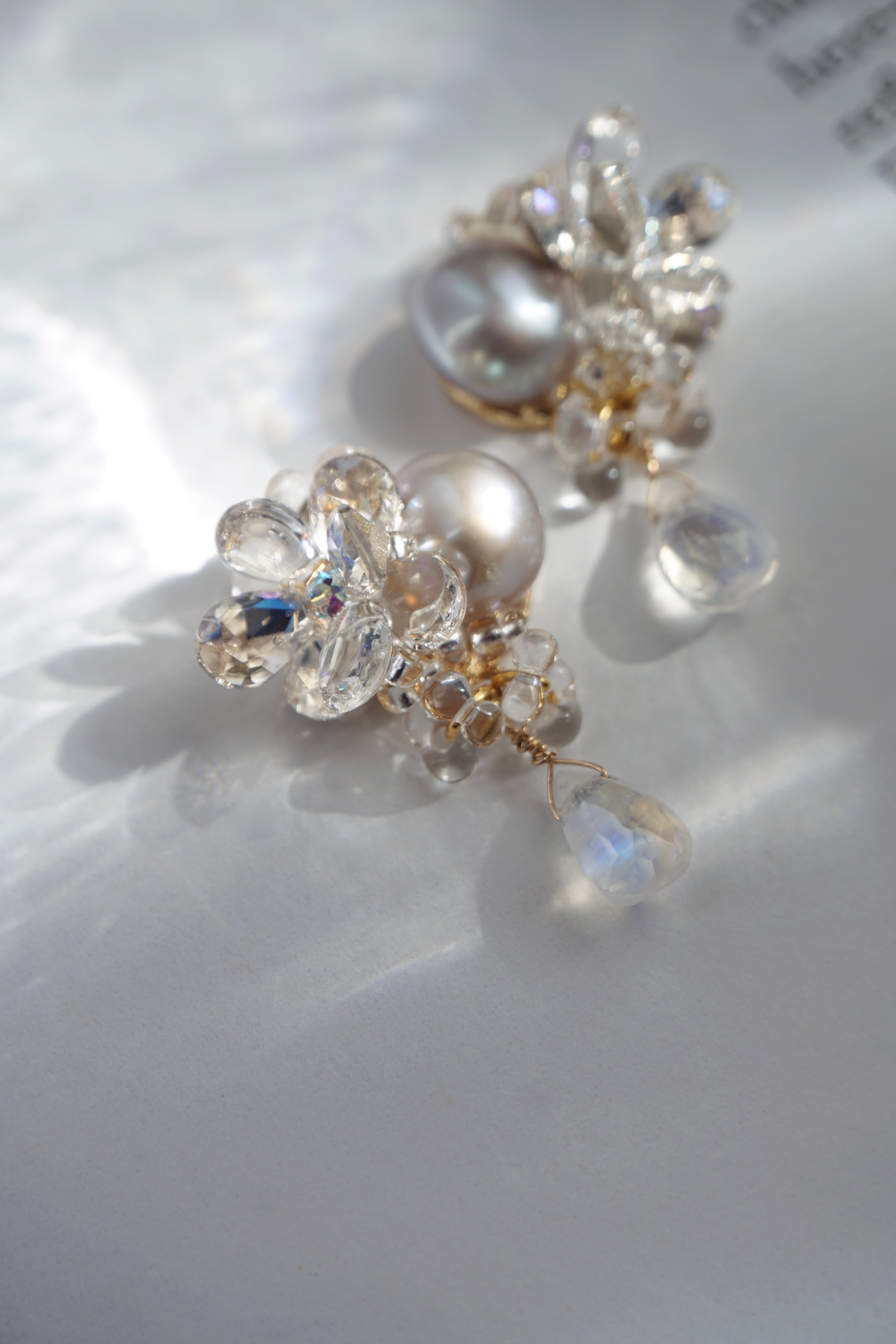 キラキラ輝くお花、天然石ラブラドライト、ふんわり優しいグレーの淡水パールが合わさった豪華な耳飾り。