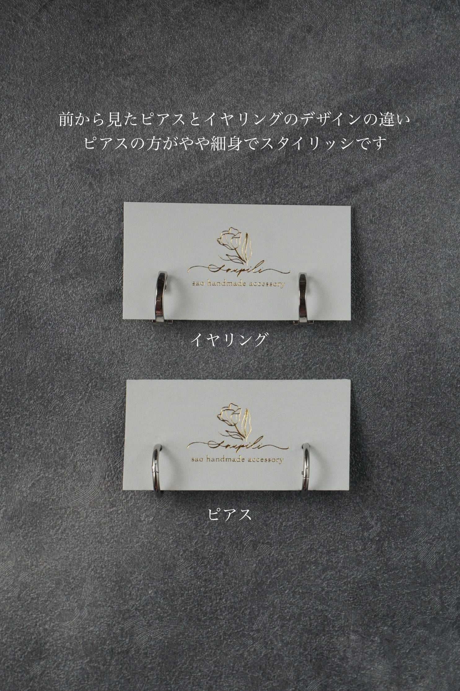 イヤリングは耳が痛くなりにくい金具を使用し、ピアスフープのように見えるデザインの金具です。